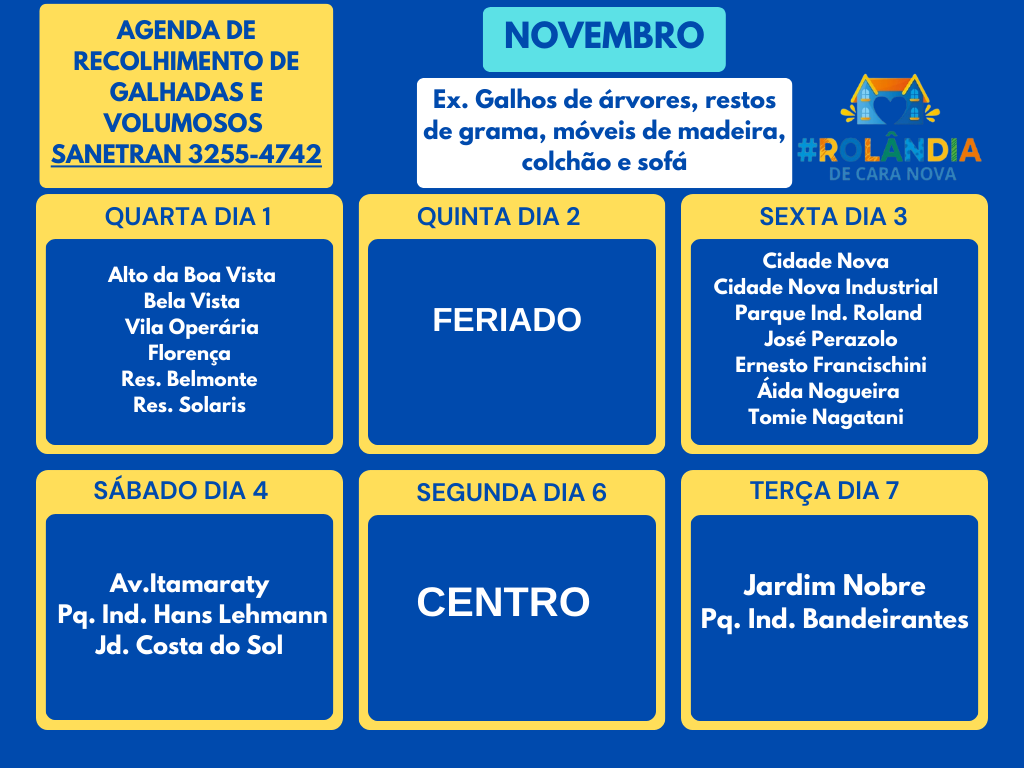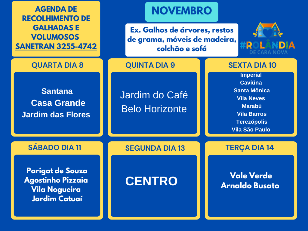 As Secretarias de Serviços Públicos e de Agricultura e Meio Ambiente informam que a empresa terceirizada que presta serviço ao município, a SANETRAN, faz a divulgação das regiões em que vai passar recolhendo volumosos deixados na calçada (móveis como sofá e eletrodomésticos da linha branca), além de restos de jardinagem e ou galhada de árvores, para o mês de NOVEMBRO.