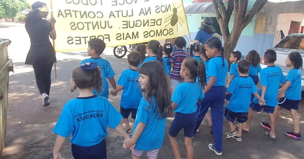 As crianças que estudam no CMEI Hans Helmut Behrend, San Fernando, com apoio de toda comunidade escolar, fizeram uma passeata em algumas ruas do bairro e entregaram panfletos de conscientização do cuidado contra a dengue aos moradores.