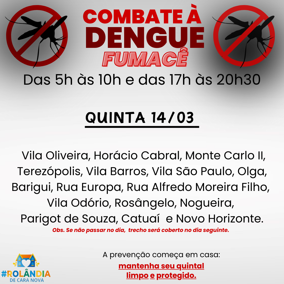 A secretaria municipal de Saúde comunica que os veículos aspergindo o fumacê vão passar em dois horários nesta quinta-feira – 14/03, das 5h às 10h e das 17h às 20h30.