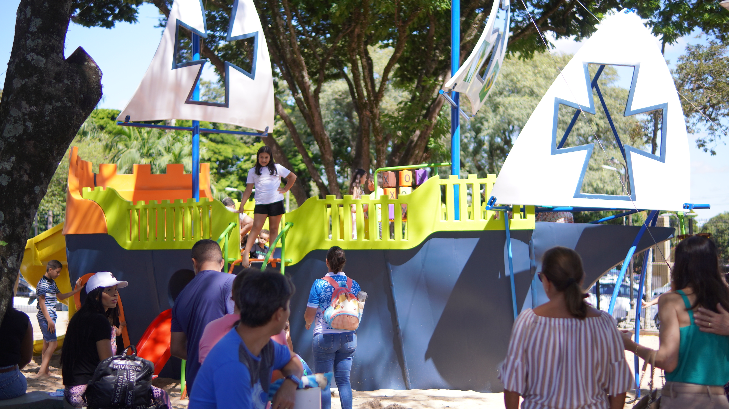 O parque conta com uma caravela entre outros equipamentos para recreação.