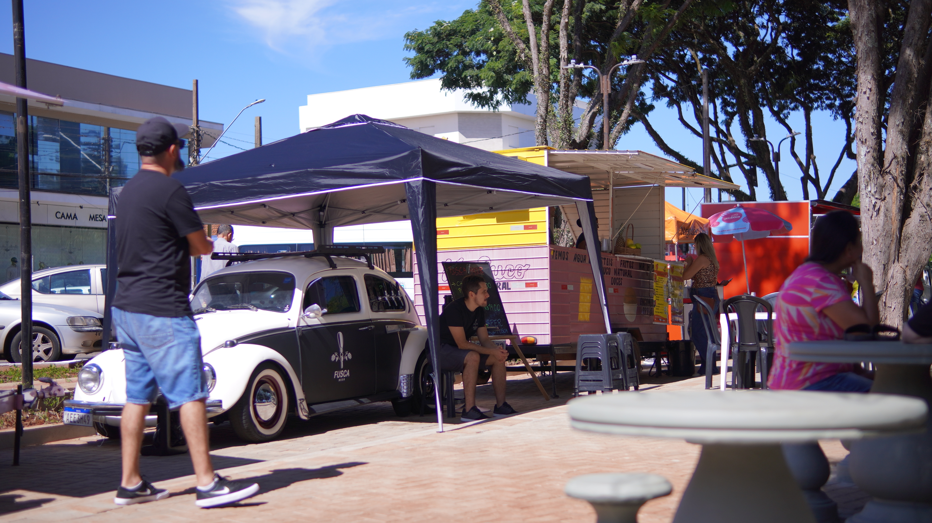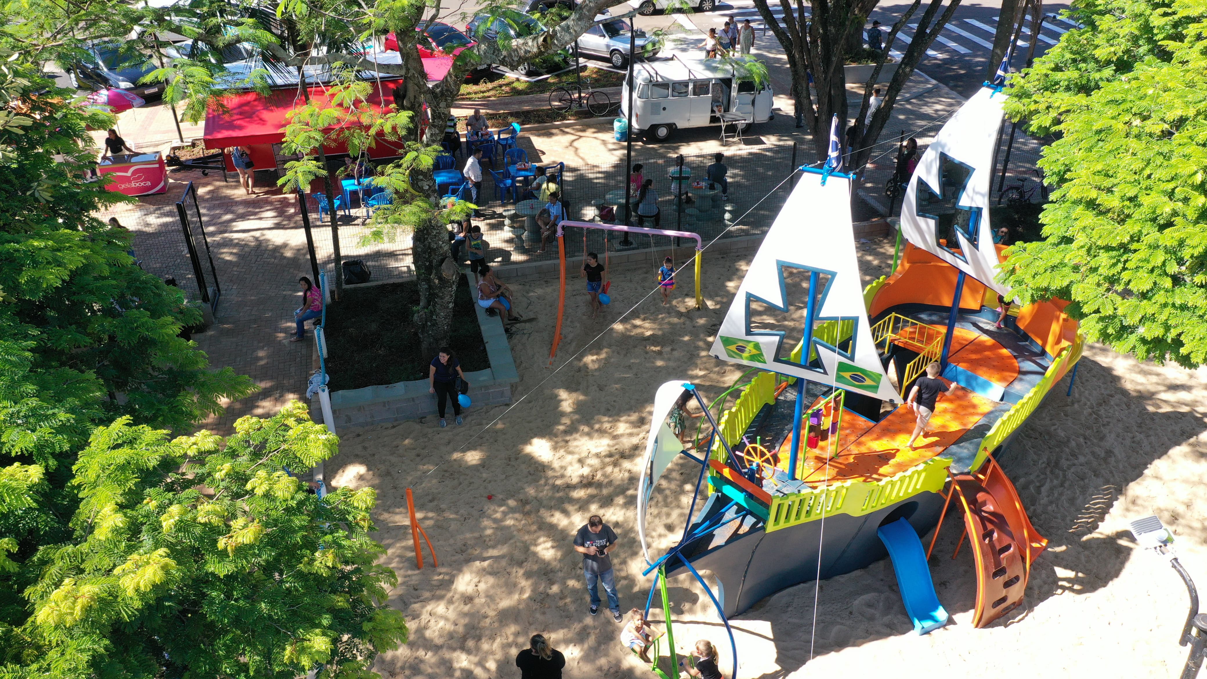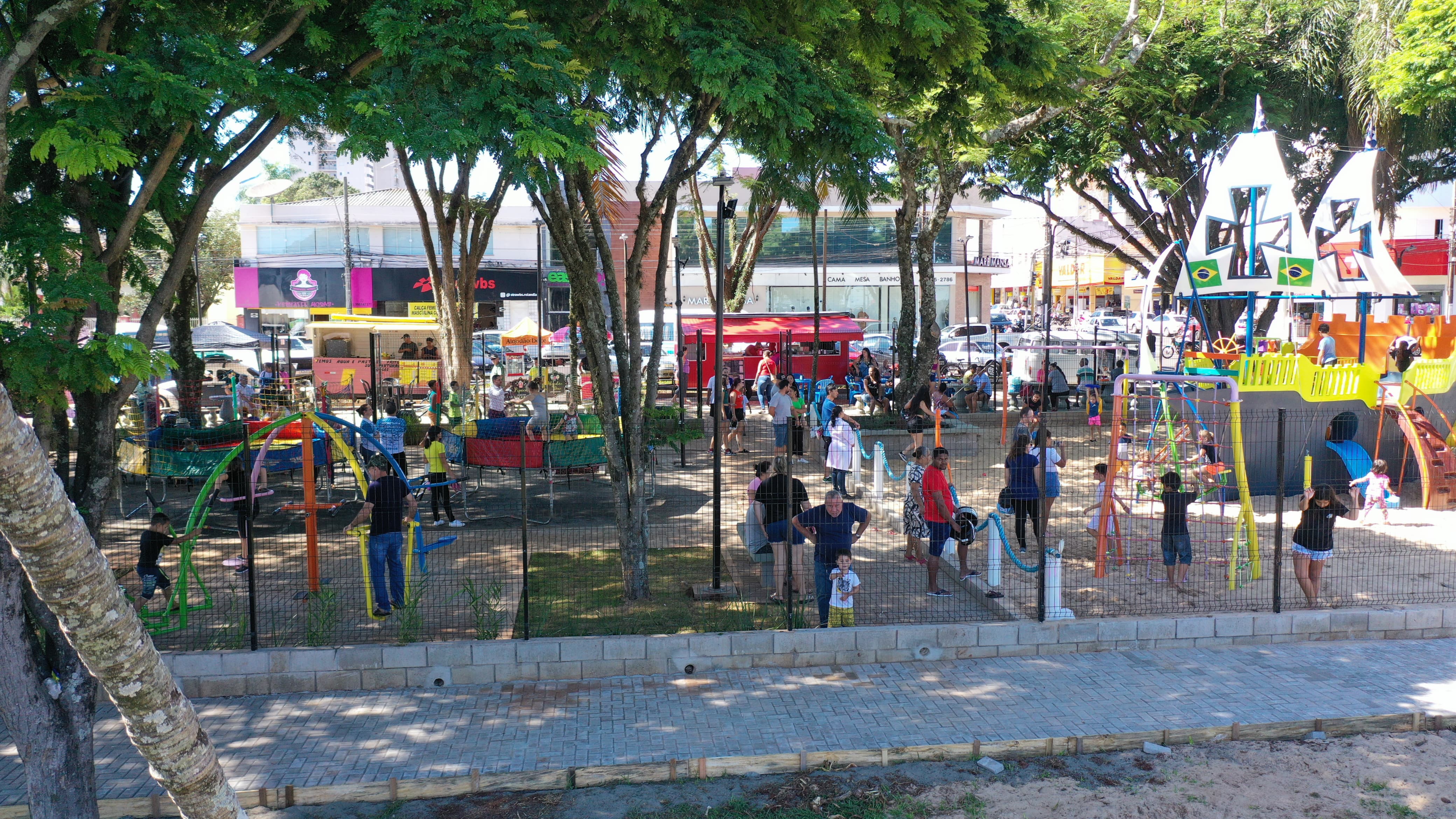 A praça foi toda revitalizada, com a troca de calçamento e paisagismo, além de agora contar com espaço para food trucks e dez novas vagas para estacionamento. O parque também recebeu gradis.