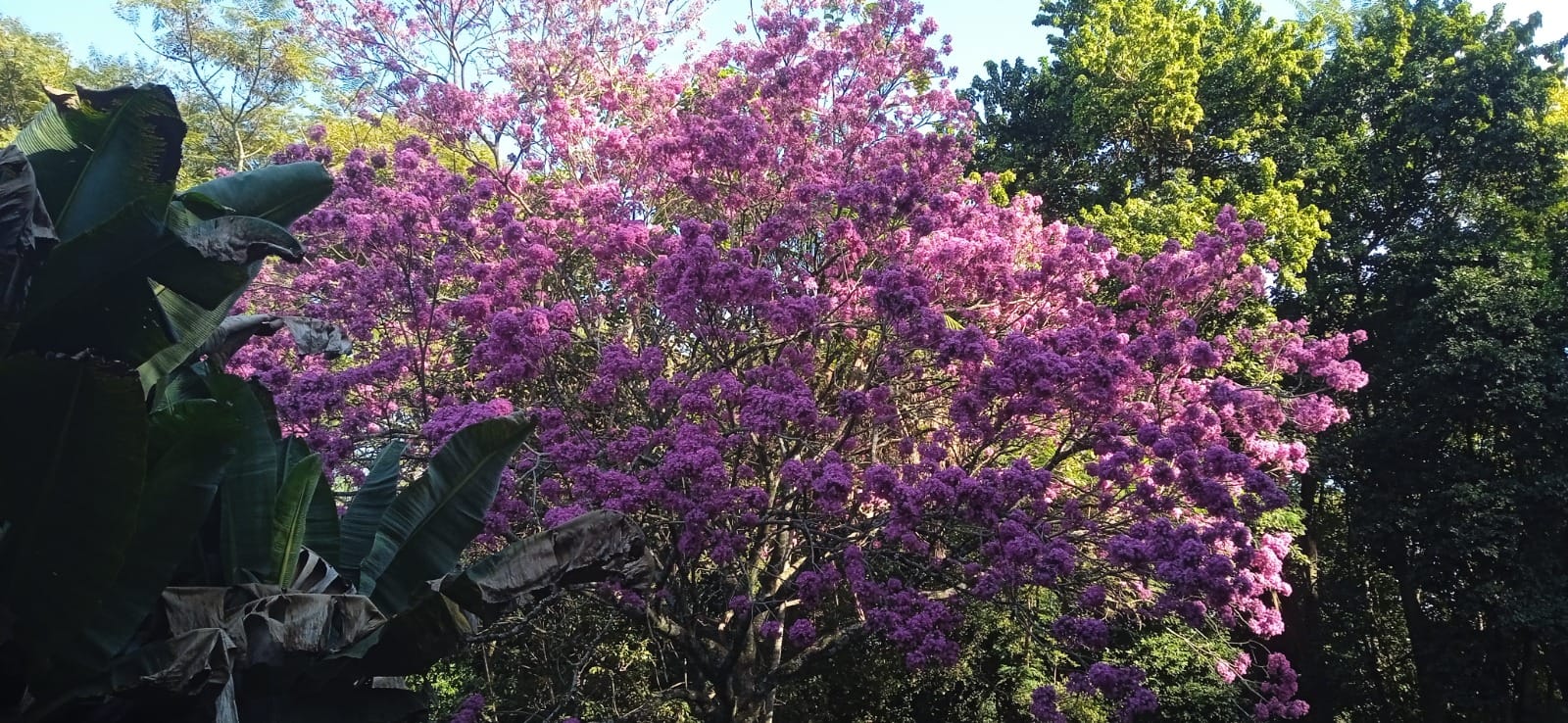 Também aprenderam sobre os cuidados com elas. Depois desse trajeto, em meio as plantações, puderam ver um maravilhoso Ipê roxo que só floresce uma vez no ano. E eles ganharam esse presente da natureza neste dia de visita!