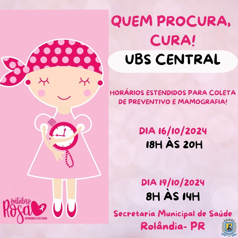 Contudo, para ampliar o horário de atendimento e oferecer a possibilidade da coleta de preventivo e o agendamento de mamografias aos sábados e no período noturno, a secretaria informa que as mulheres de Rolândia também serão atendidas: