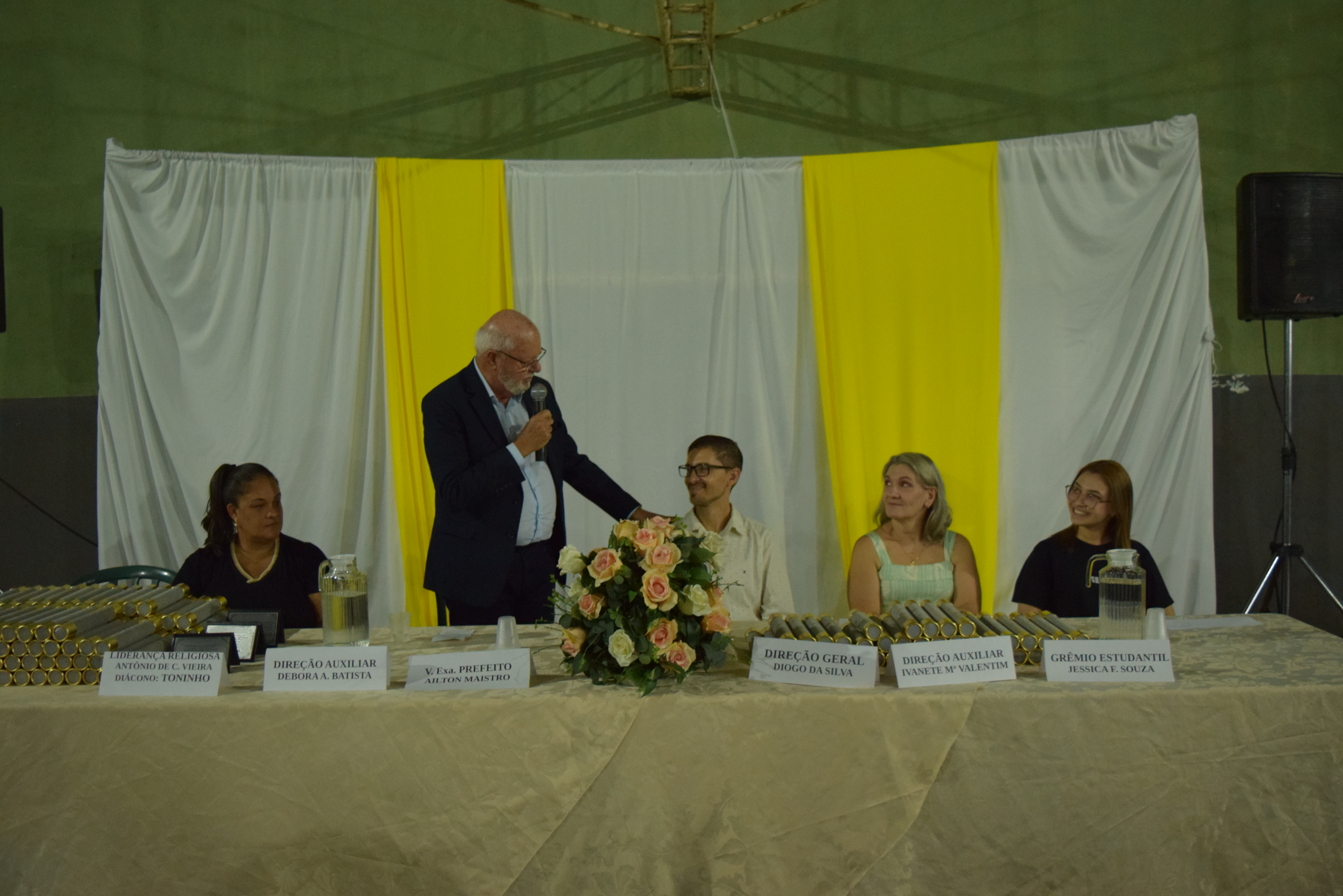A mesa de autoridades contou ainda com o diretor do colégio, Diogo da Silva, as diretoras auxiliares Ivanete Valentim e Débora Batista, a representante do Grêmio Estudantil Jéssica Souza e o diácono Antonio Vieira (Toninho), que levou uma palavra de fé aos presentes na cerimônia. Estiveram ainda no ato, professores, colaboradores e a equipe do colégio, além de familiares e convidados dos formandos.