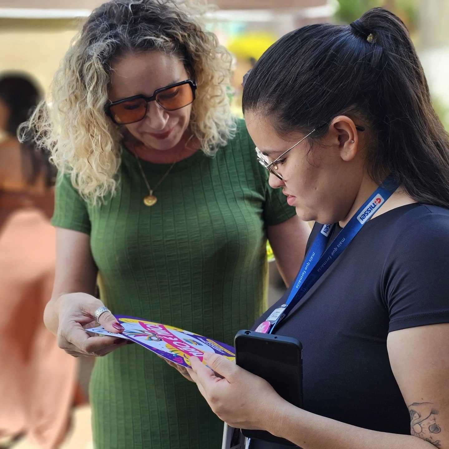 A secretária de Assistência Social, Michele Pereira, a diretora de Políticas Públicas para às Mulheres, Viviane Vernilo, e servidoras municipais estão fazendo a distribuição de leques, com telefones úteis para quando uma mulher precisar de apoio ou socorro!