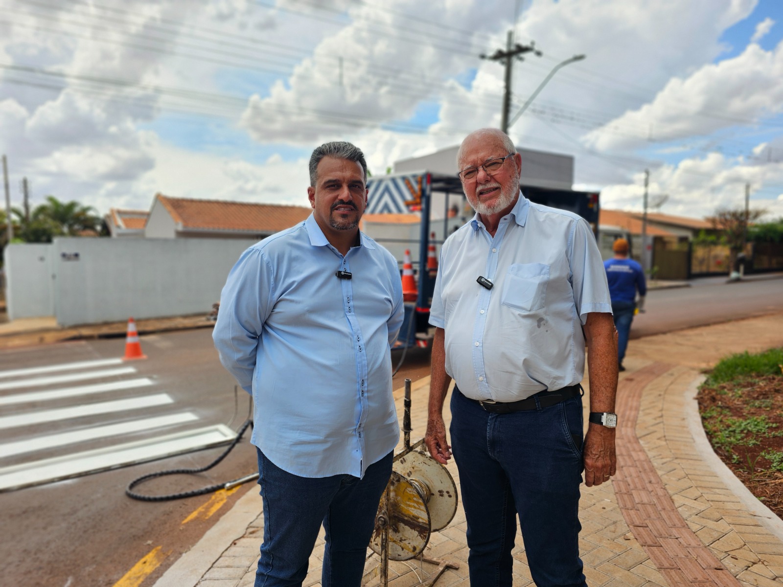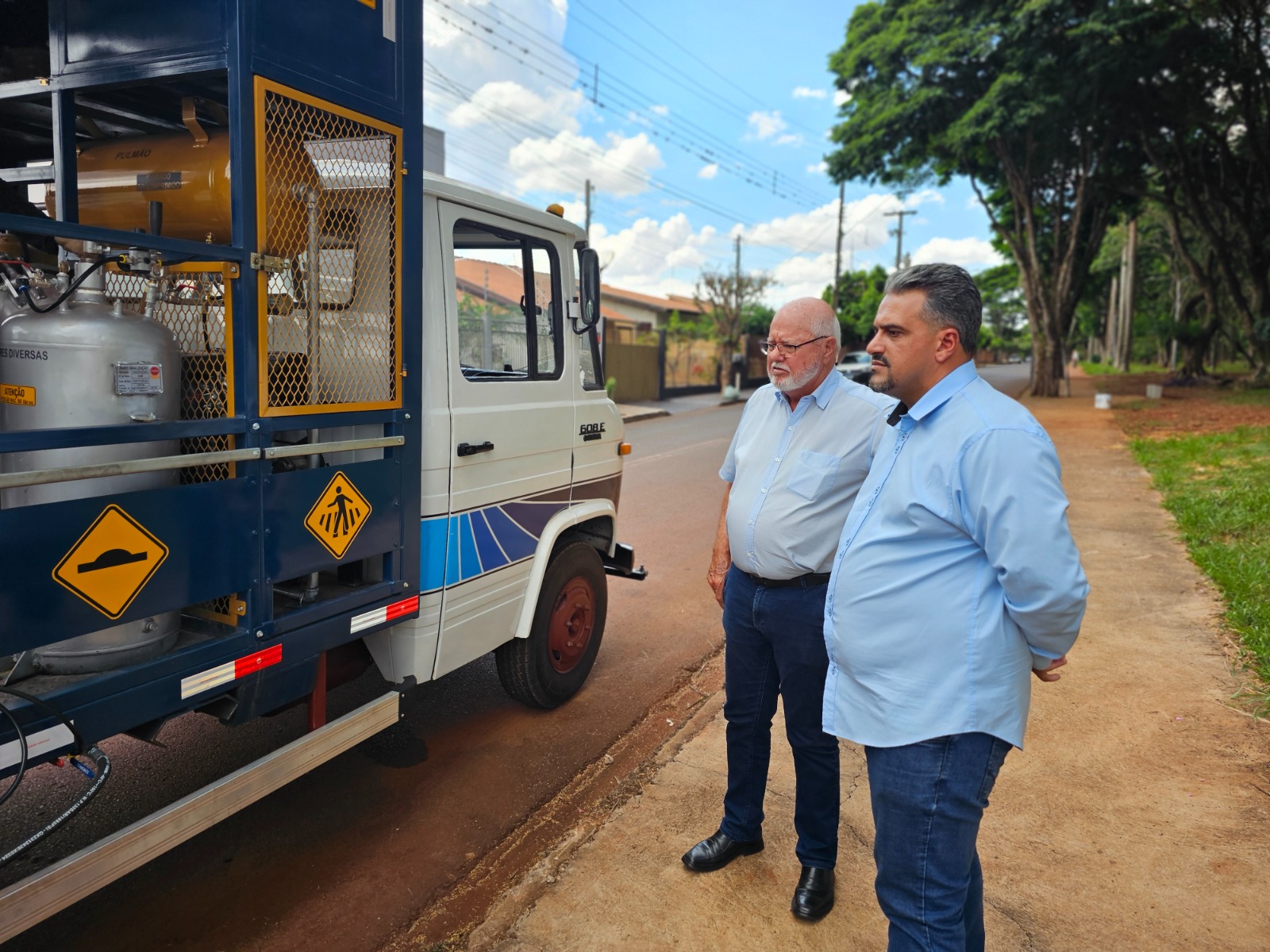 O prefeito Ailton Maistro e o secretário de Infraestrutura e Serviços Públicos, Lucinei Masson, foram conferir o início dos trabalhos do novo caminhão de pintura viária e sinalização de trânsito.
