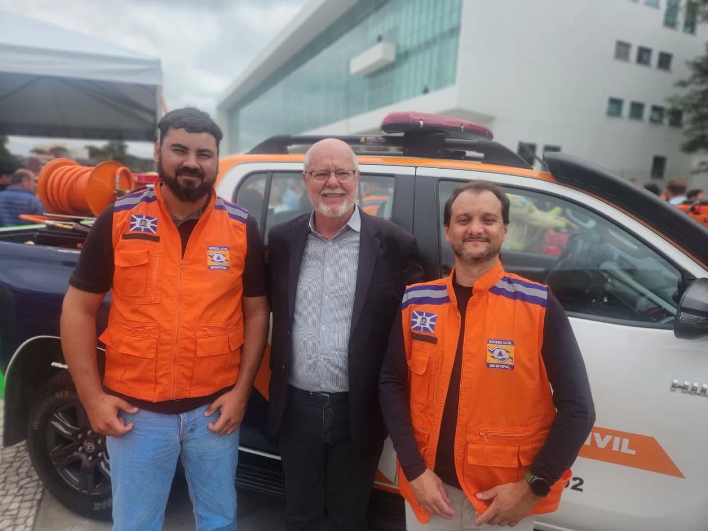 O prefeito Ailton Maistro e os servidores municipais da secretaria de Agricultura e Meio Ambiente, Miguel Consani Nogueira (coordenador da Defesa Civil Municipal) e Renan Andrade (membro da Defesa Civil) receberam nesta terça-feira, dia 15 de abril, em solenidade em Curitiba, no Palácio do Iguaçu, novos equipamentos para melhor equipar a Defesa Civil Municipal. O secretário de Planejamento, Zeca Salgueiro, e os vereadores Guilherme Spanguemberg (presidente da Câmara) e Gesiel Araújo também prestigiaram a solenidade. A entrega é uma ação conjunta entre a Secretaria de Estado do Desenvolvimento Sustentável (Sedest) e da Defesa Civil Estadual.