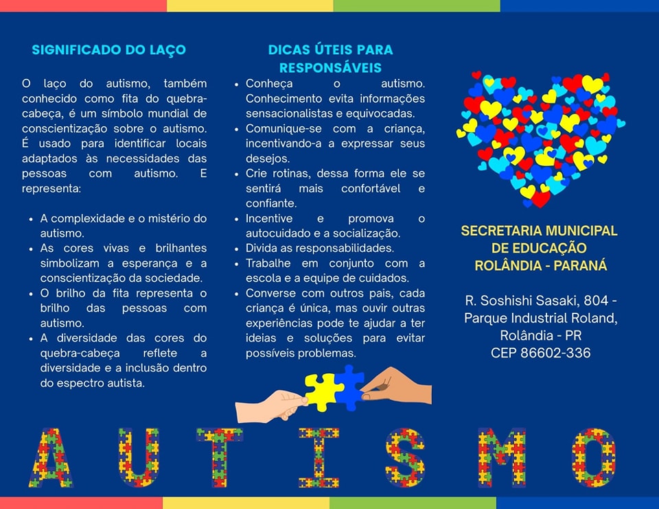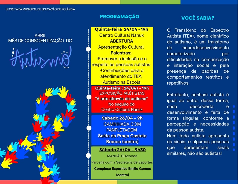 A secretaria de Educação informa que para celebrar o “Dia Mundial da Conscientização do Autismo”, ao longo do mês de abril, promove atividades e ações que levam conscientização à população rolandense sobre o tema.
