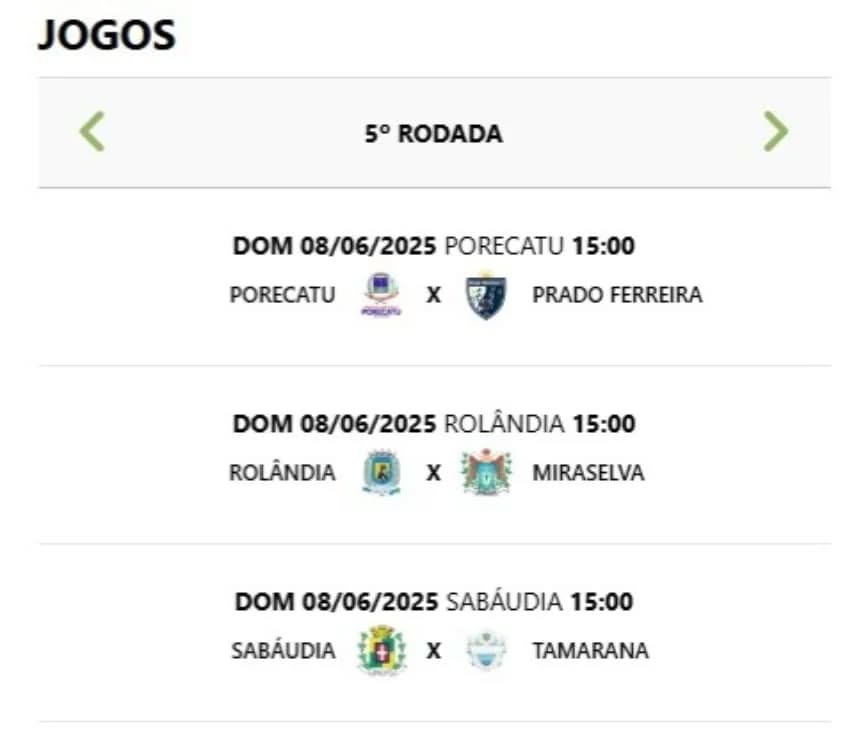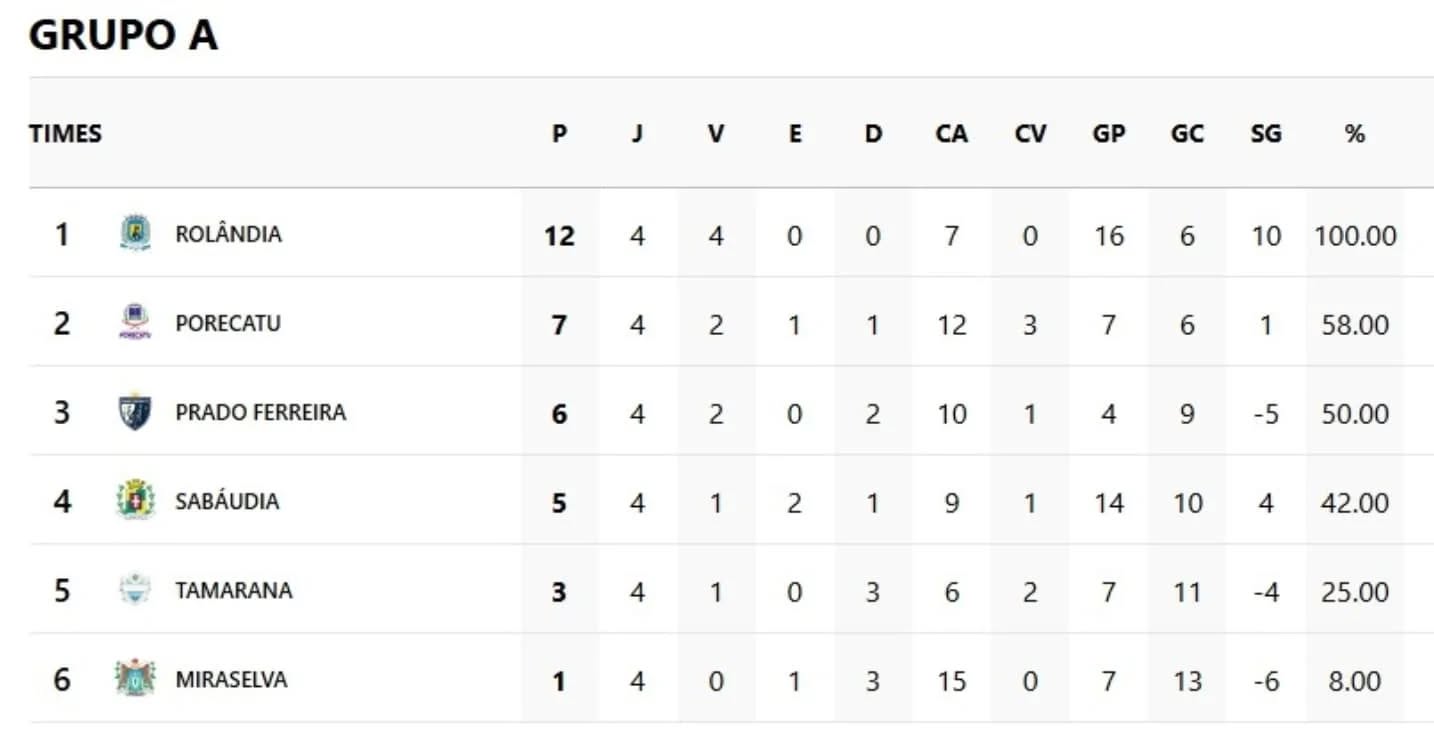 Até aqui, o time de Rolândia tem quatro jogos e quatro vitórias: 3x1 Tamarana, Porecatu (5x2), Prado Ferreira (3x0) e Sabáudia (5x3). É o único 100% de aproveitamento no certame.