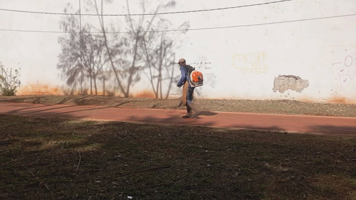 O trabalho confere mais asseio e segurança aos usuários do espaço e está sendo feito na região do Manoel Muller. O diretor da secretaria, Sandro Leonardi, acompanha a atividade.