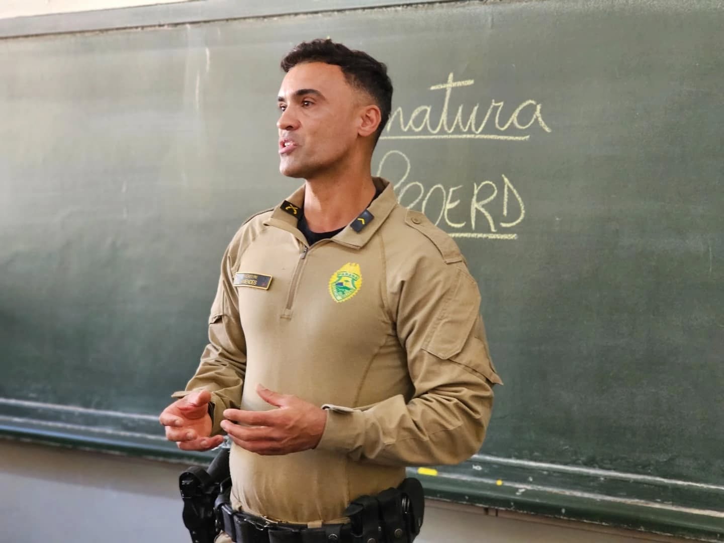 São três Policiais Militares que atendem nosso município. Para esse ano de 2025, o Programa trouxe um material diferenciado para os nossos alunos autistas - um livro totalmente adaptado com atividades pensadas e elaboradas para que a inclusão, também, esteja presente no PROERD.