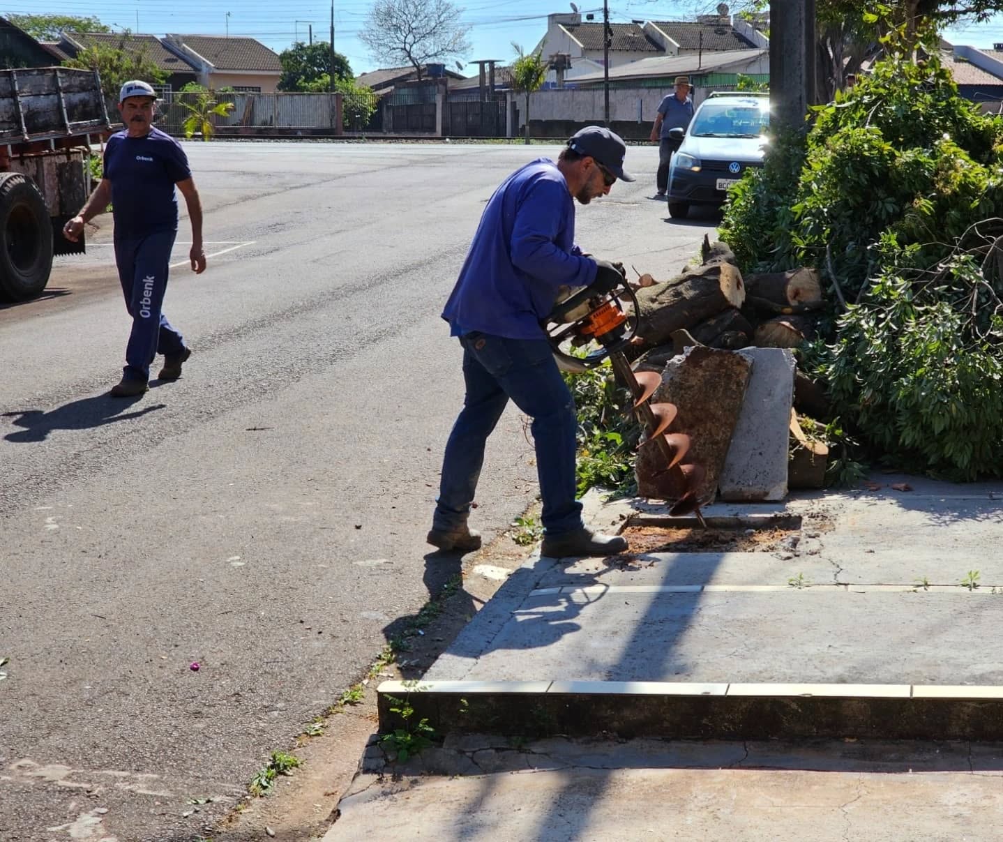 Por isso, a SEMMA fez um mutirão com a equipe completa: técnicos ambientais, equipe de corte e poda, equipe de destoca e equipe de substituição, com apoio da empresa terceirizada Sanetran.