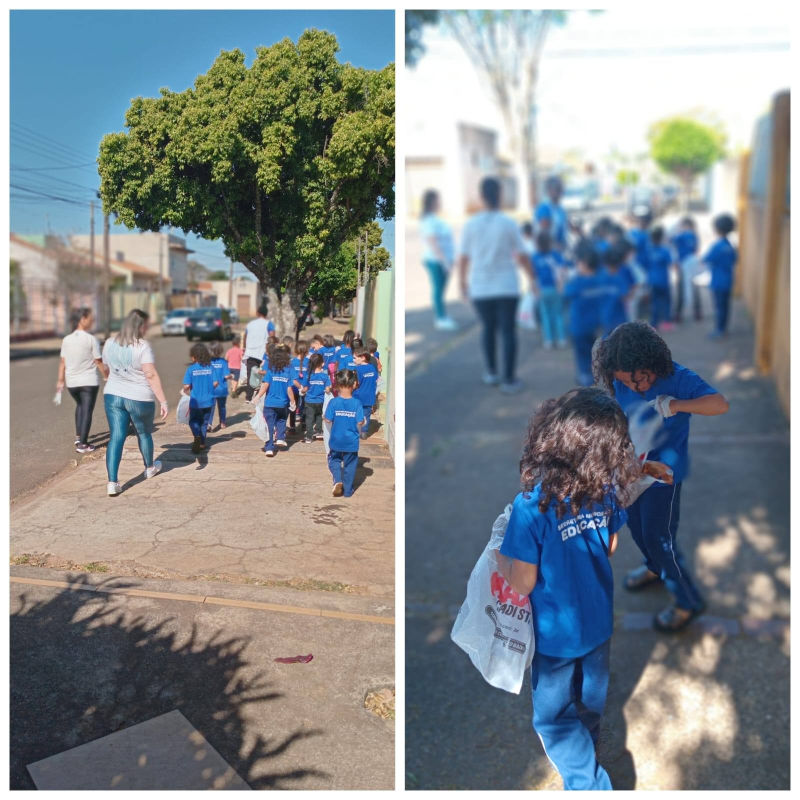 Como prática, a professora planejou um passeio ao entorno do espaço, para observarem e também recolher alguns lixos descartáveis que eles vissem pelas ruas.