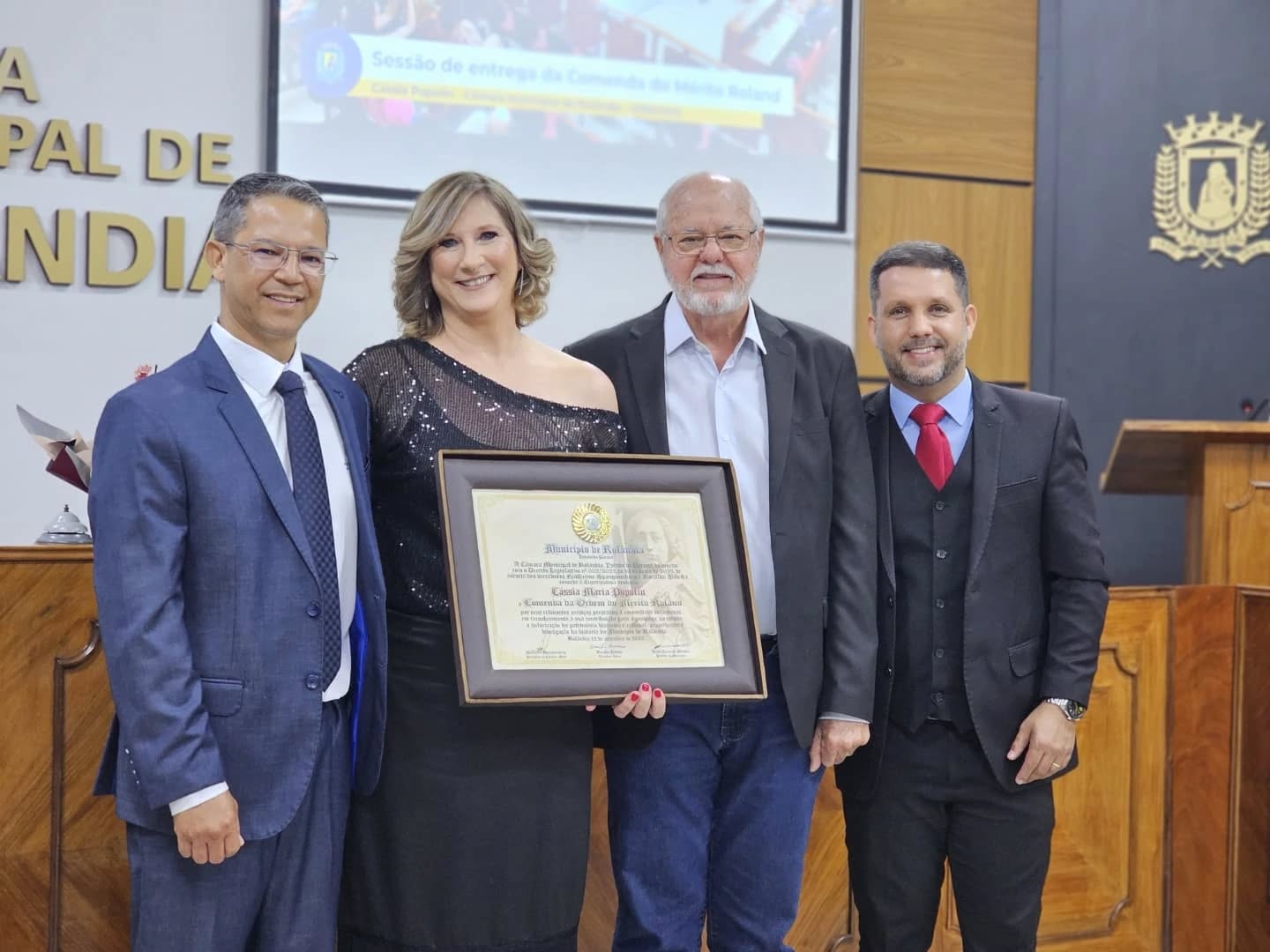Nesta sexta-feira, dia 12 de setembro, uma solenidade na Câmara Municipal entregou a mais alta honraria do município, a Comenda da Ordem do Mérito Roland, à jornalista, fotógrafa e historiadora Cássia Maria Popolin.