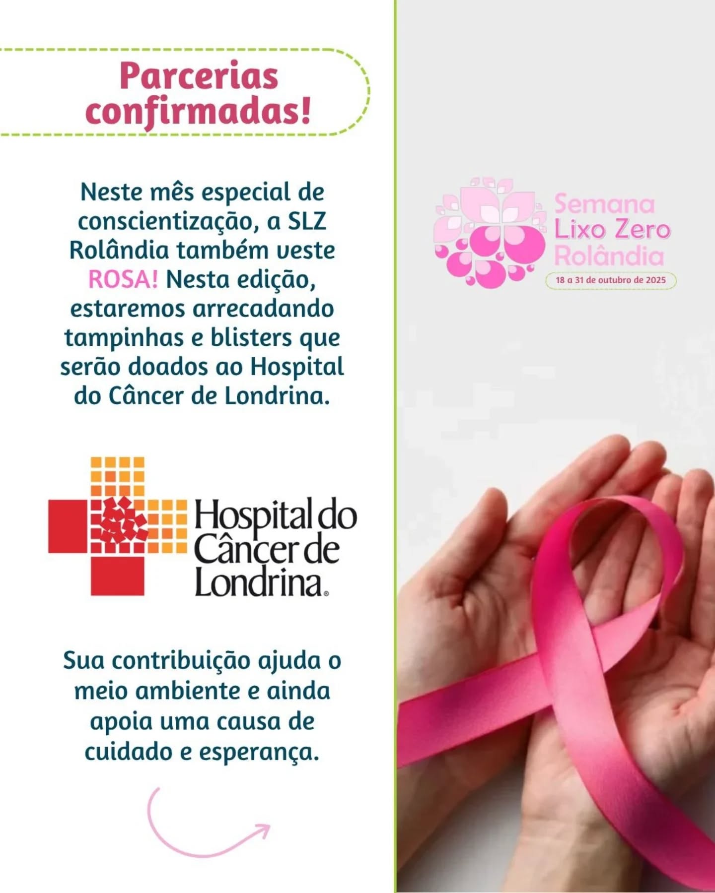 Durante todo o mês de outubro, em destaque à Semana Lixo Zero Rolândia (18 a 31 de outubro de 2025), estaremos realizando uma campanha especial: a arrecadação de tampinhas plásticas e blisters de remédios, que serão destinados ao Hospital do Câncer de Londrina.