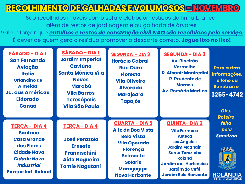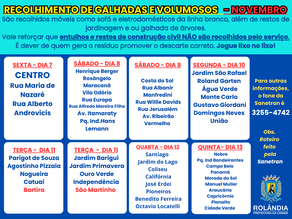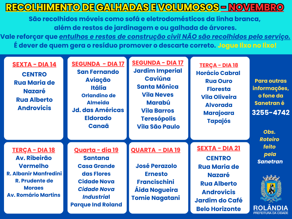 As Secretarias de Serviços Públicos e de Agricultura e Meio Ambiente informam que a empresa terceirizada que presta serviço ao município, a SANETRAN, passa recolhendo volumosos deixados na calçada (móveis como sofá e eletrodomésticos da linha branca), além de restos de jardinagem e ou galhada de árvores.