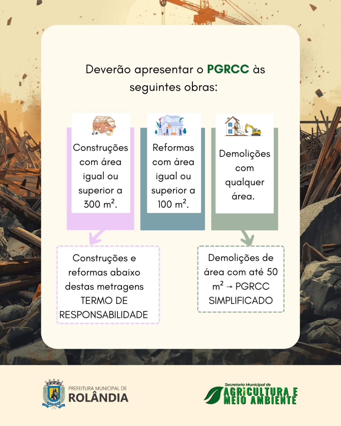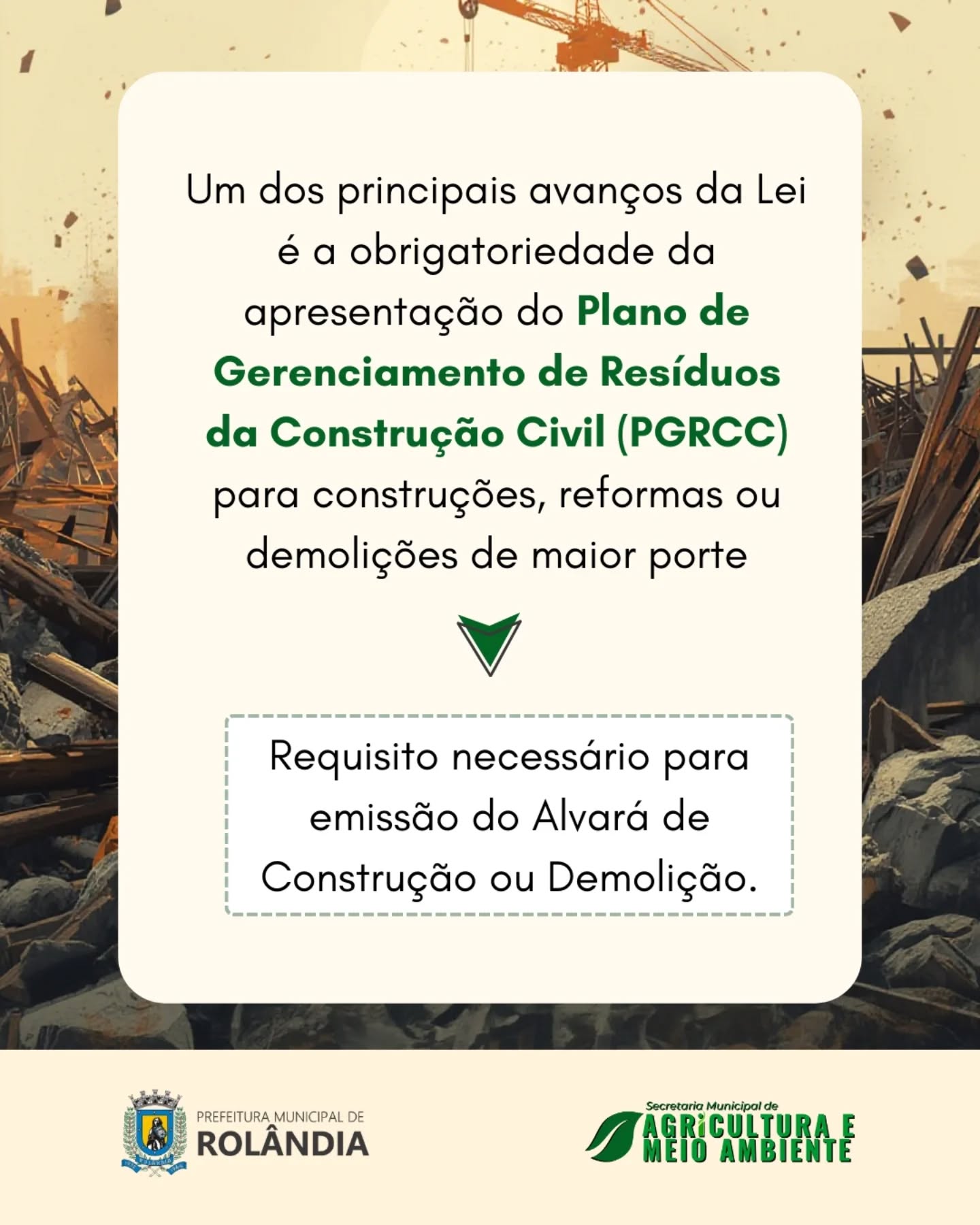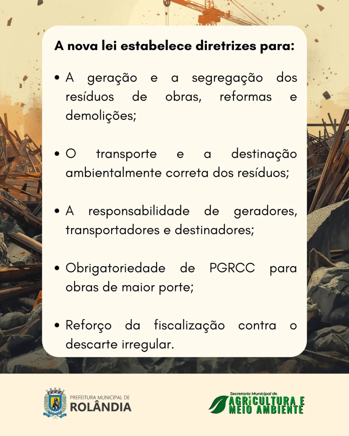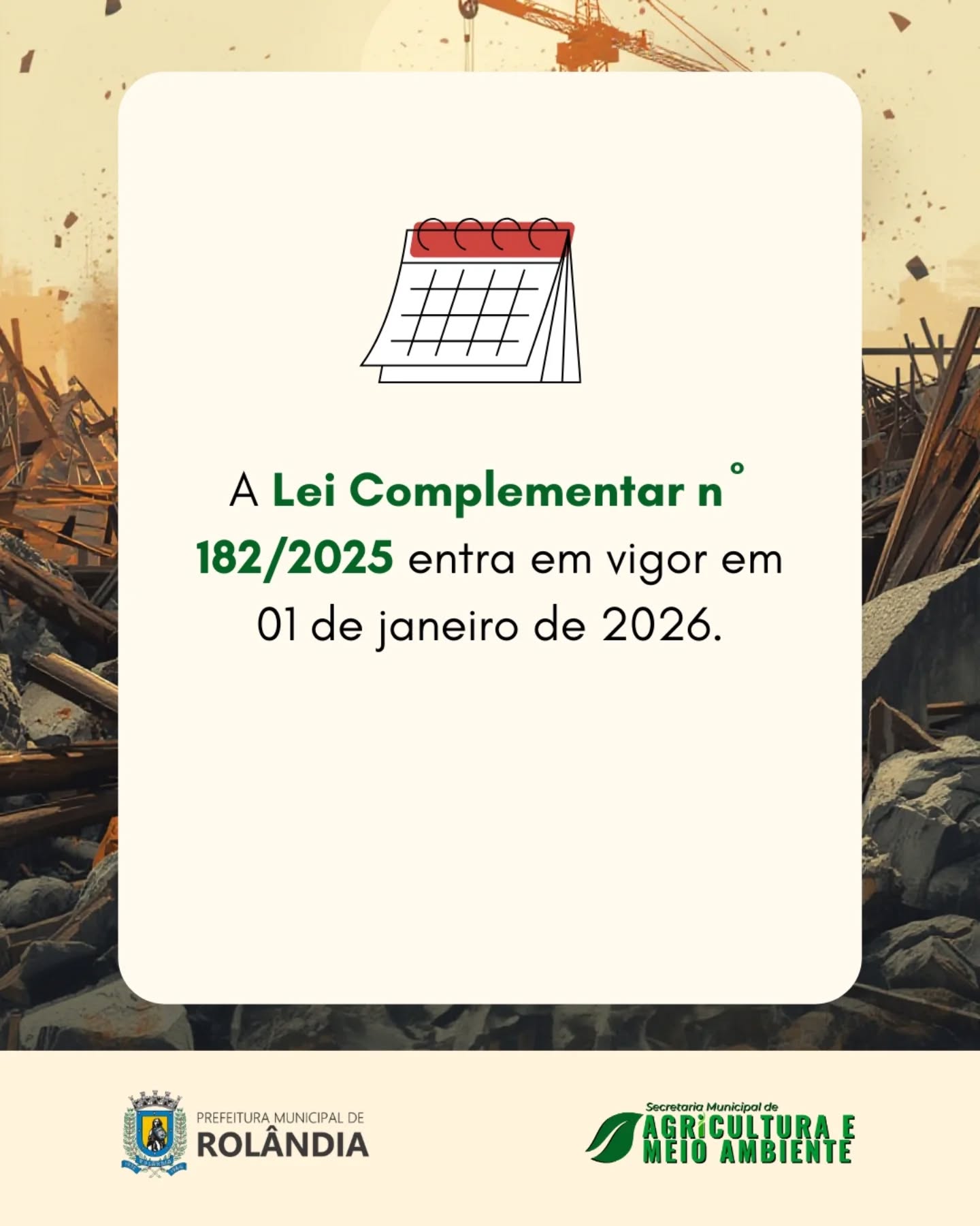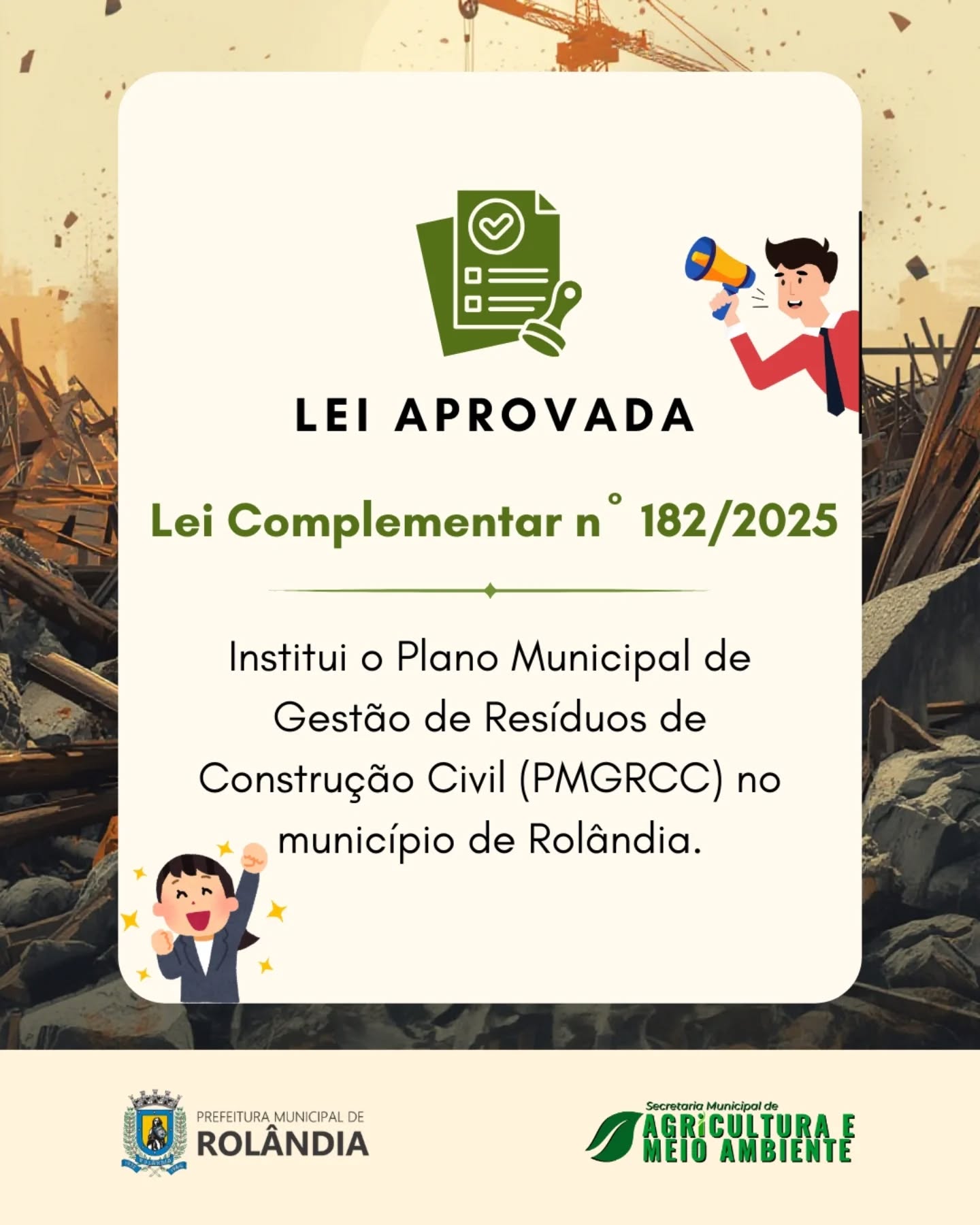 A aprovação da Lei Complementar nº 182/2025 institui o Plano Municipal de Gestão de Resíduos da Construção Civil (PMGRCC), que estabelece regras claras para a geração, o transporte e a destinação adequada dos resíduos de obras, reformas e demolições.