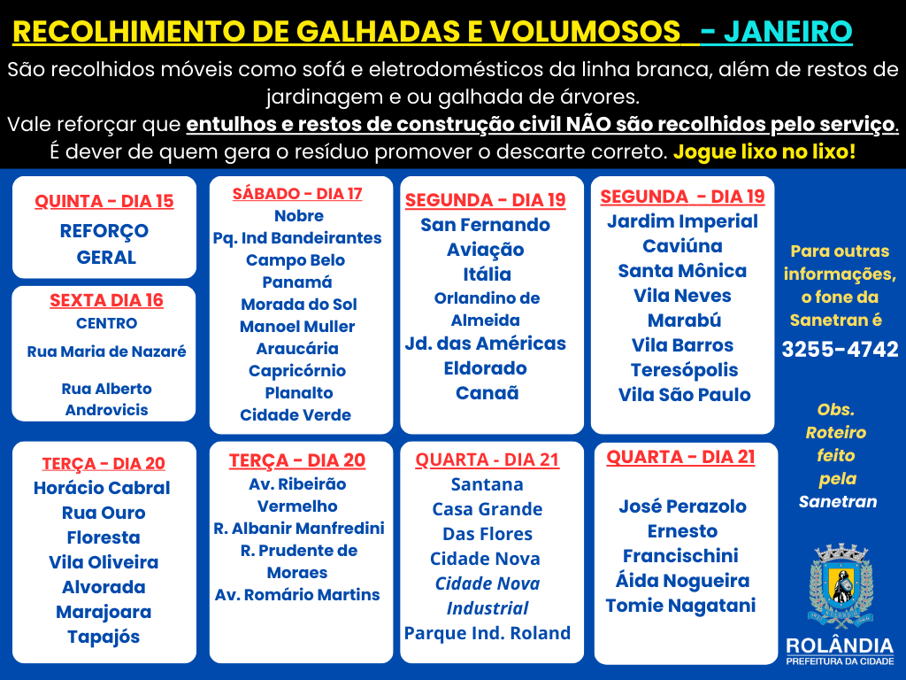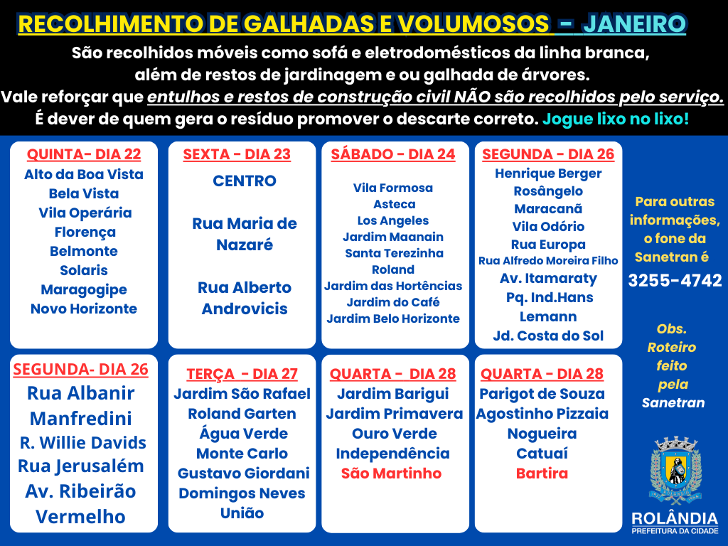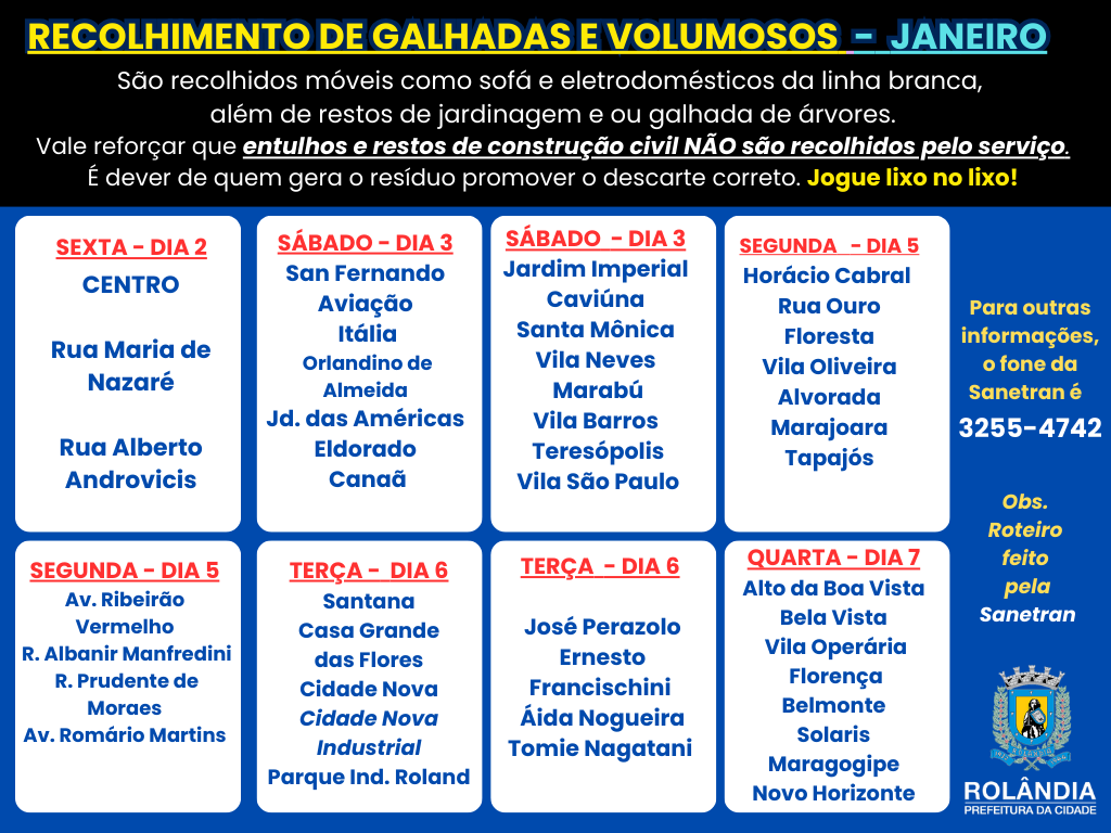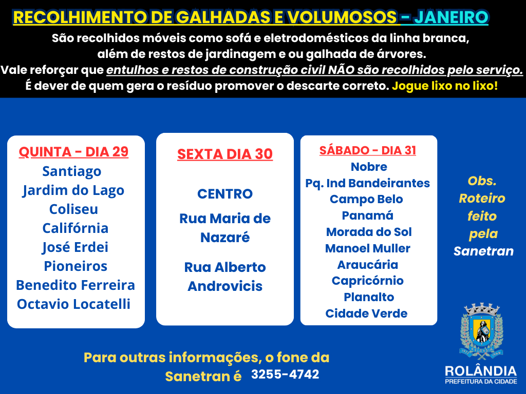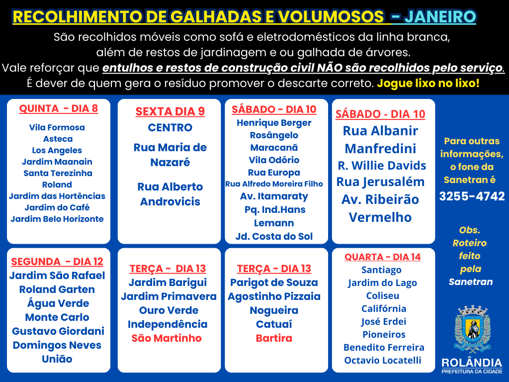 As Secretarias de Serviços Públicos e de Agricultura e Meio Ambiente informam que a empresa terceirizada que presta serviço ao município, a SANETRAN, passa recolhendo volumosos deixados na calçada (móveis como sofá e eletrodomésticos da linha branca), além de restos de jardinagem e ou galhada de árvores.