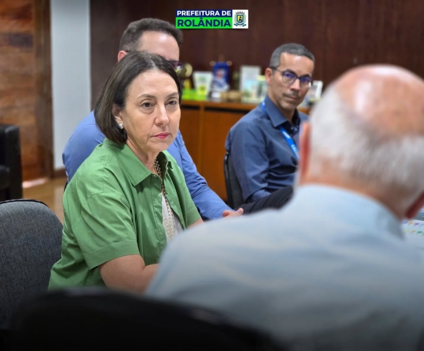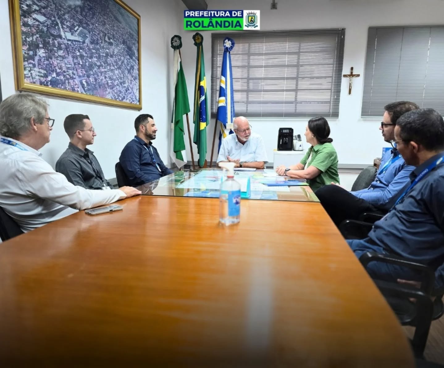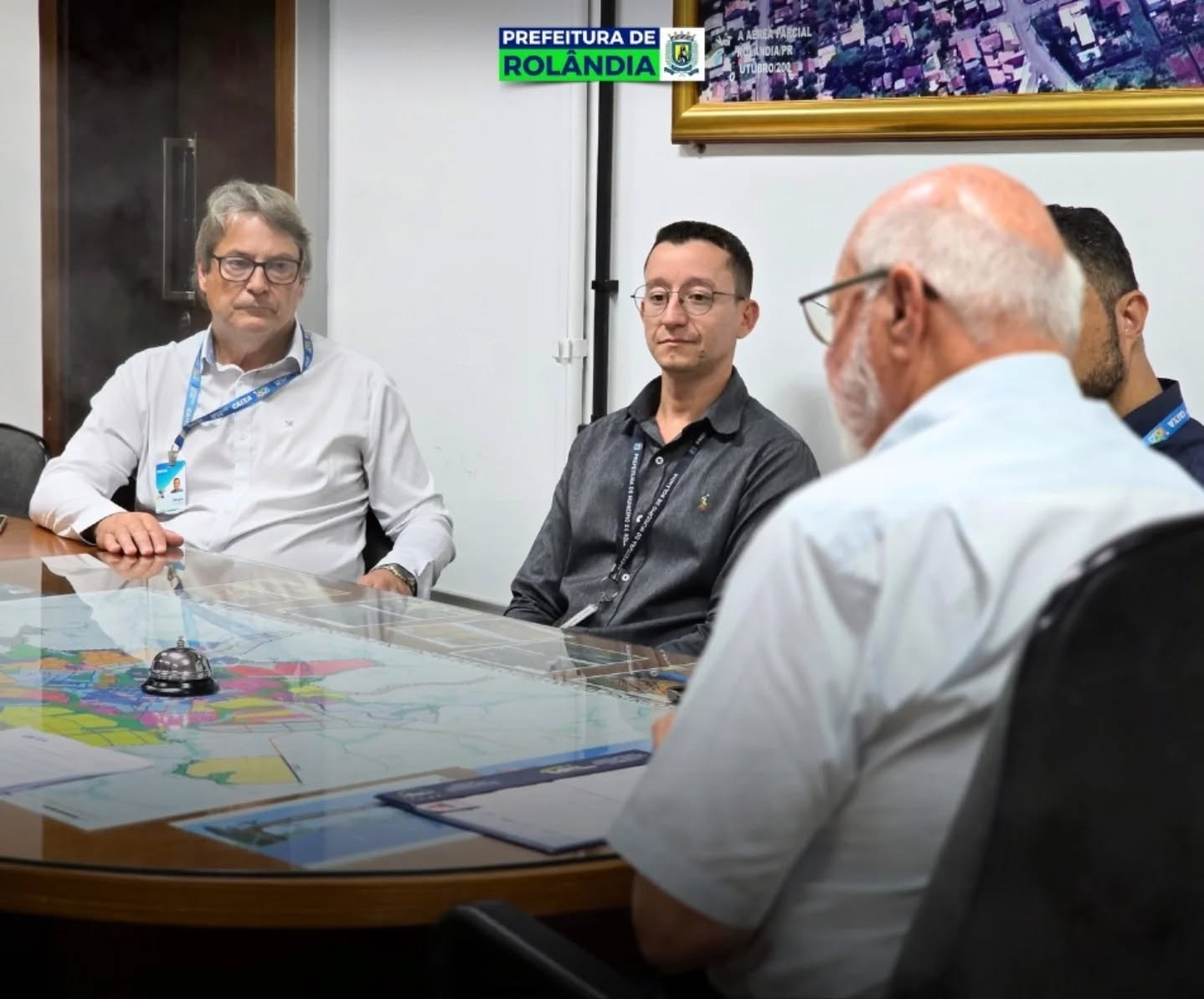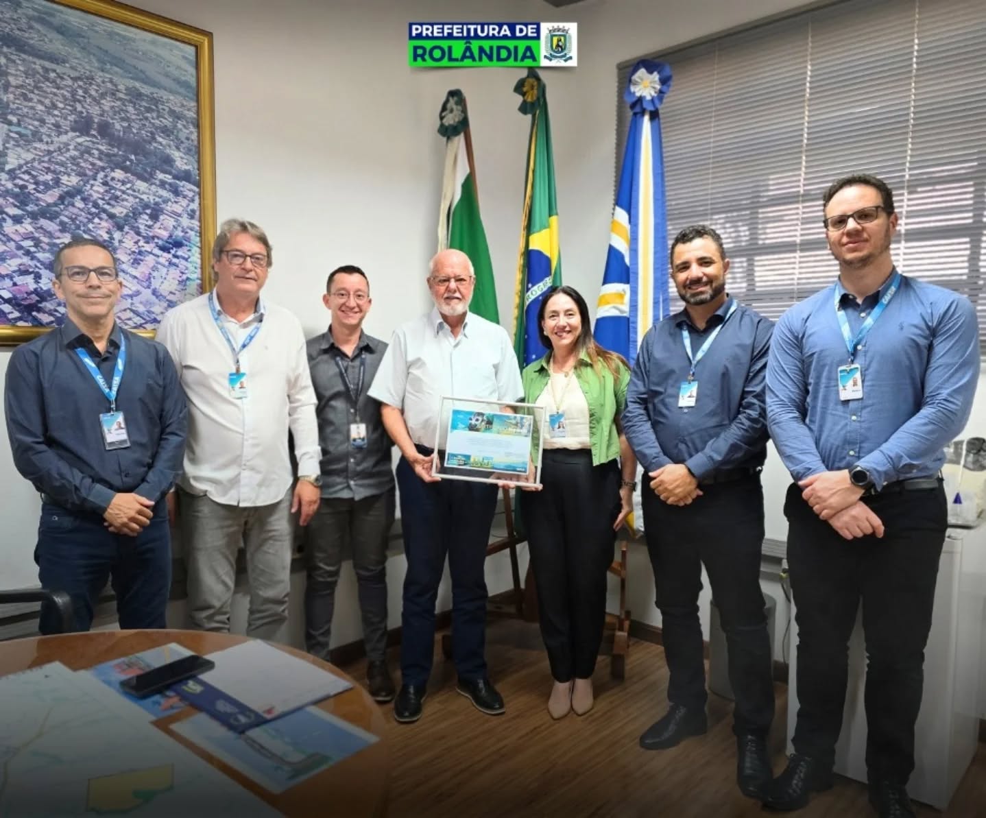 O prefeito Ailton Maistro e o secretário de Finanças, Eder Evangelista, receberam, no gabinete do prefeito, o documento das mãos de representantes da CAIXA Econômica Federal: Viviane Barcala Gonçalves, superintendente executiva de governo para o norte do Paraná; Messias Anacleto Rosa Júnior, coordenador da CAIXA; Maikol Cesar Abreu, gerente da CAIXA; o gerente da agência de Rolândia, Marcos de Freitas Lima; e o técnico bancário da agência Rolândia, Sérgio Segalla.