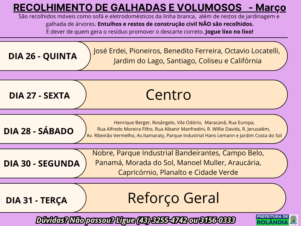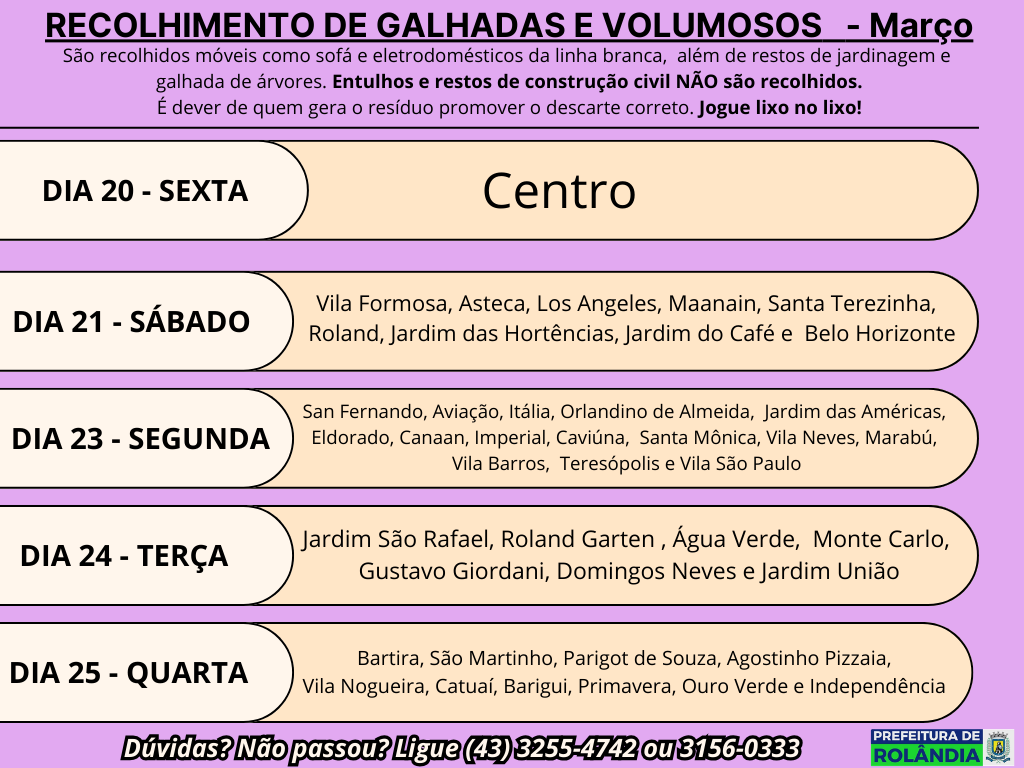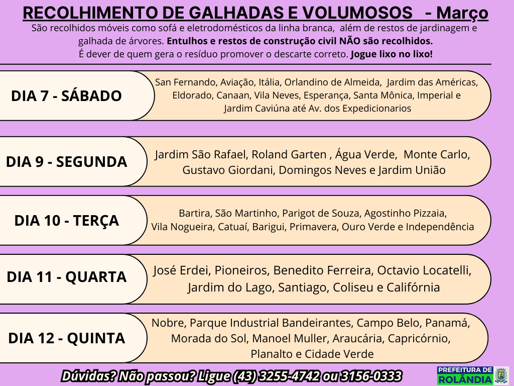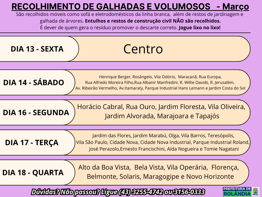 As Secretarias de Serviços Públicos e de Agricultura e Meio Ambiente informam que a empresa terceirizada que presta serviço ao município, a SANETRAN, passa recolhendo volumosos deixados na calçada (móveis como sofá e eletrodomésticos da linha branca), além de restos de jardinagem e ou galhada de árvores.