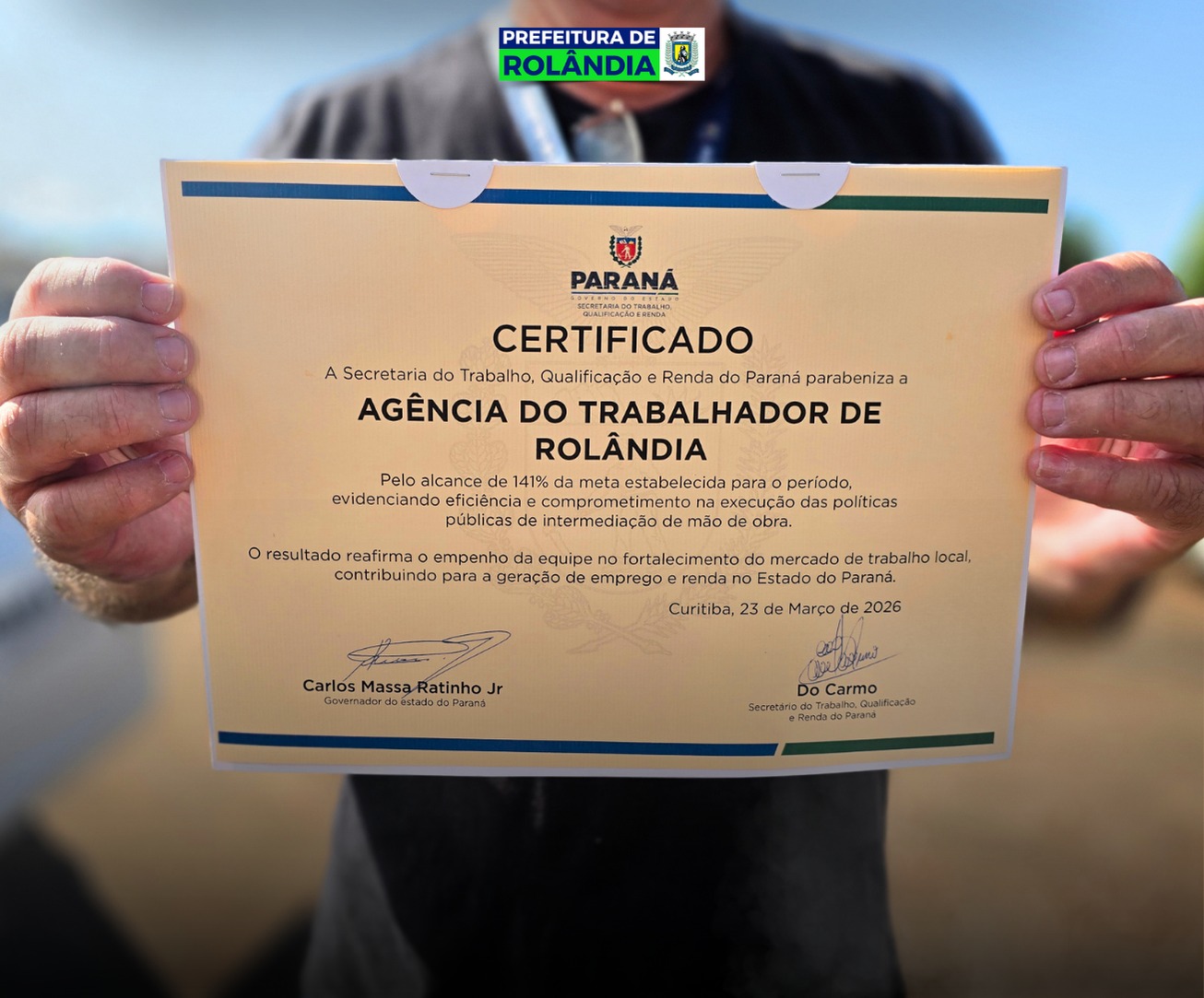 O Governo do Estado também entregou uma titulação de valorização do trabalho do Sine, porque Rolândia bateu a meta da empregabilidade, alcançando 141% do que foi estabelecido pelo Estado, resultando na condição de "Pleno Emprego" ao município.