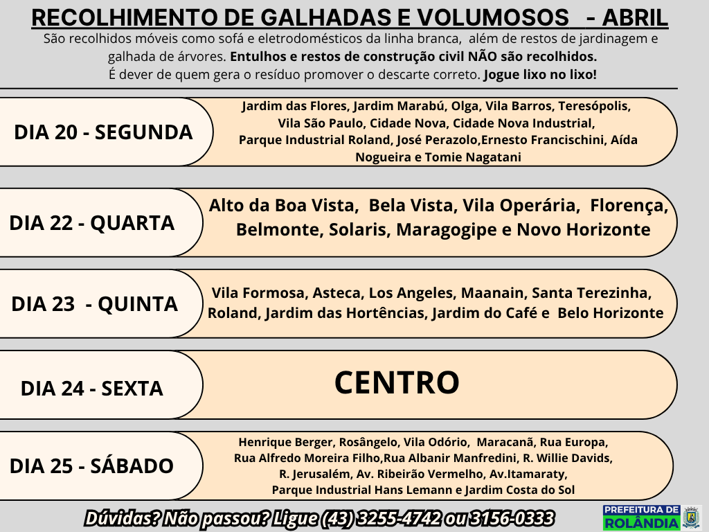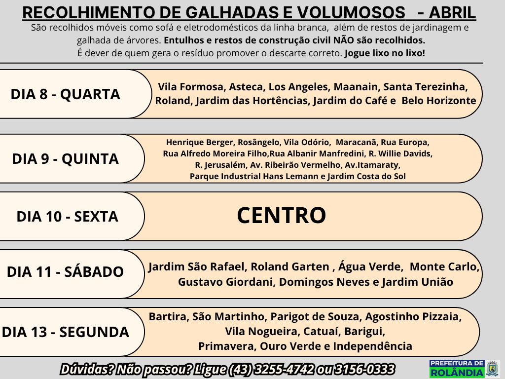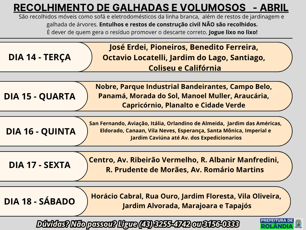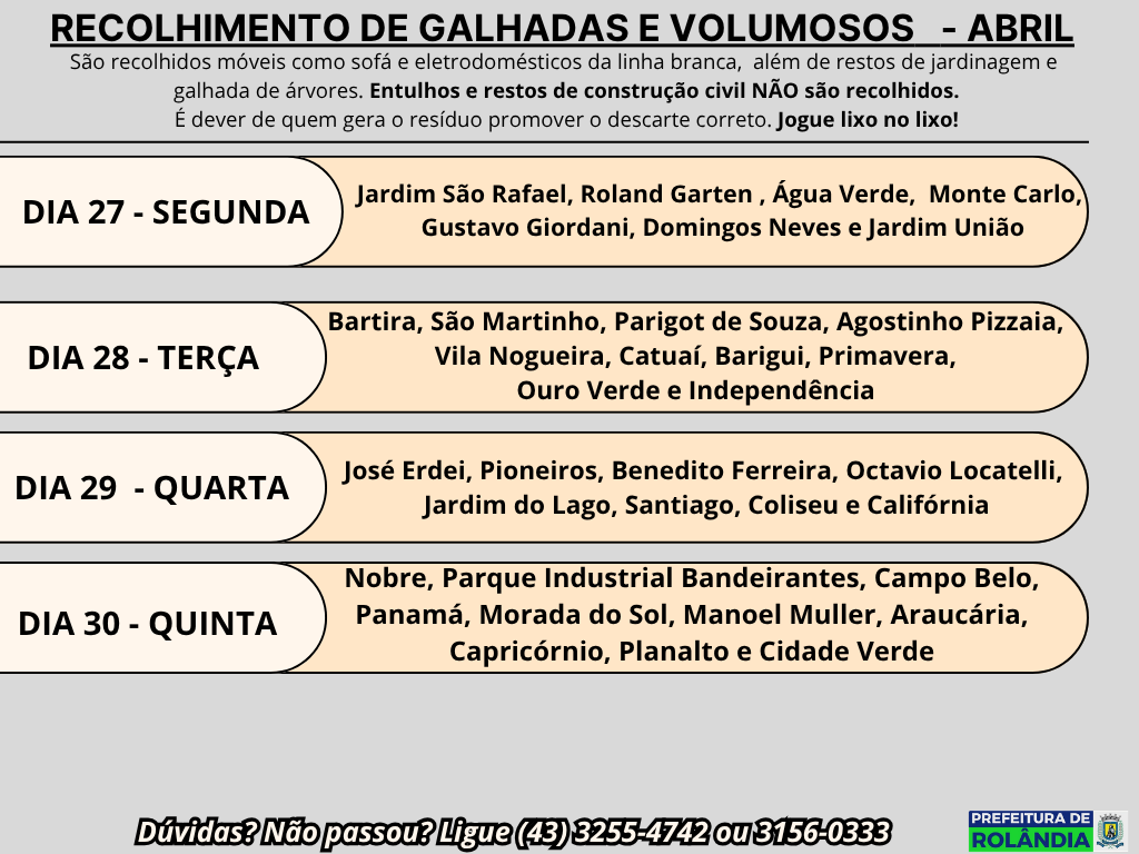 As Secretarias de Serviços Públicos e de Agricultura e Meio Ambiente informam que a empresa terceirizada que presta serviço ao município, a SANETRAN, passa recolhendo volumosos deixados na calçada (móveis como sofá e eletrodomésticos da linha branca), além de restos de jardinagem e ou galhada de árvores.