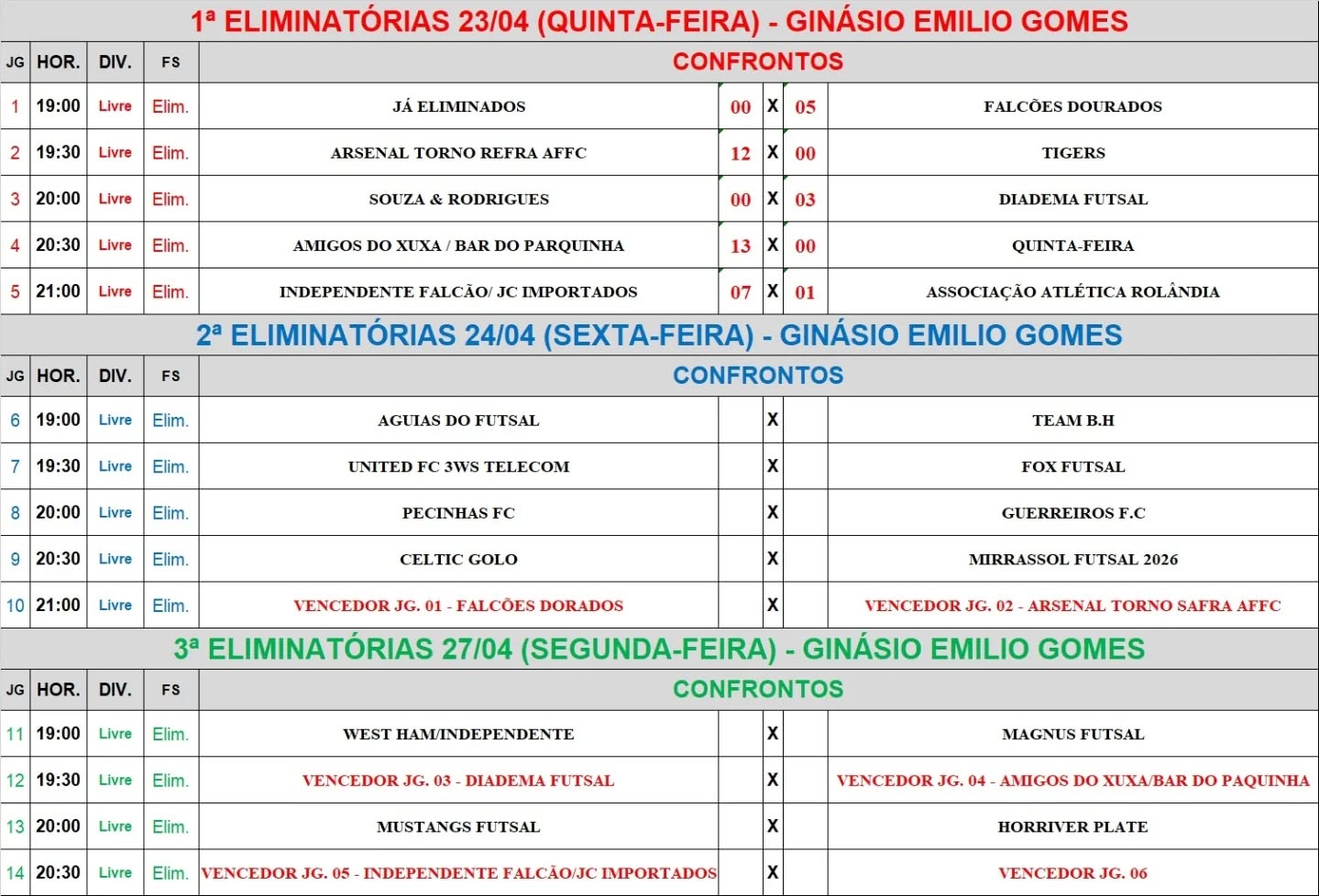 41 gols na primeira noite de eliminatórias do futsal, no Torneio Primeiro de Maio