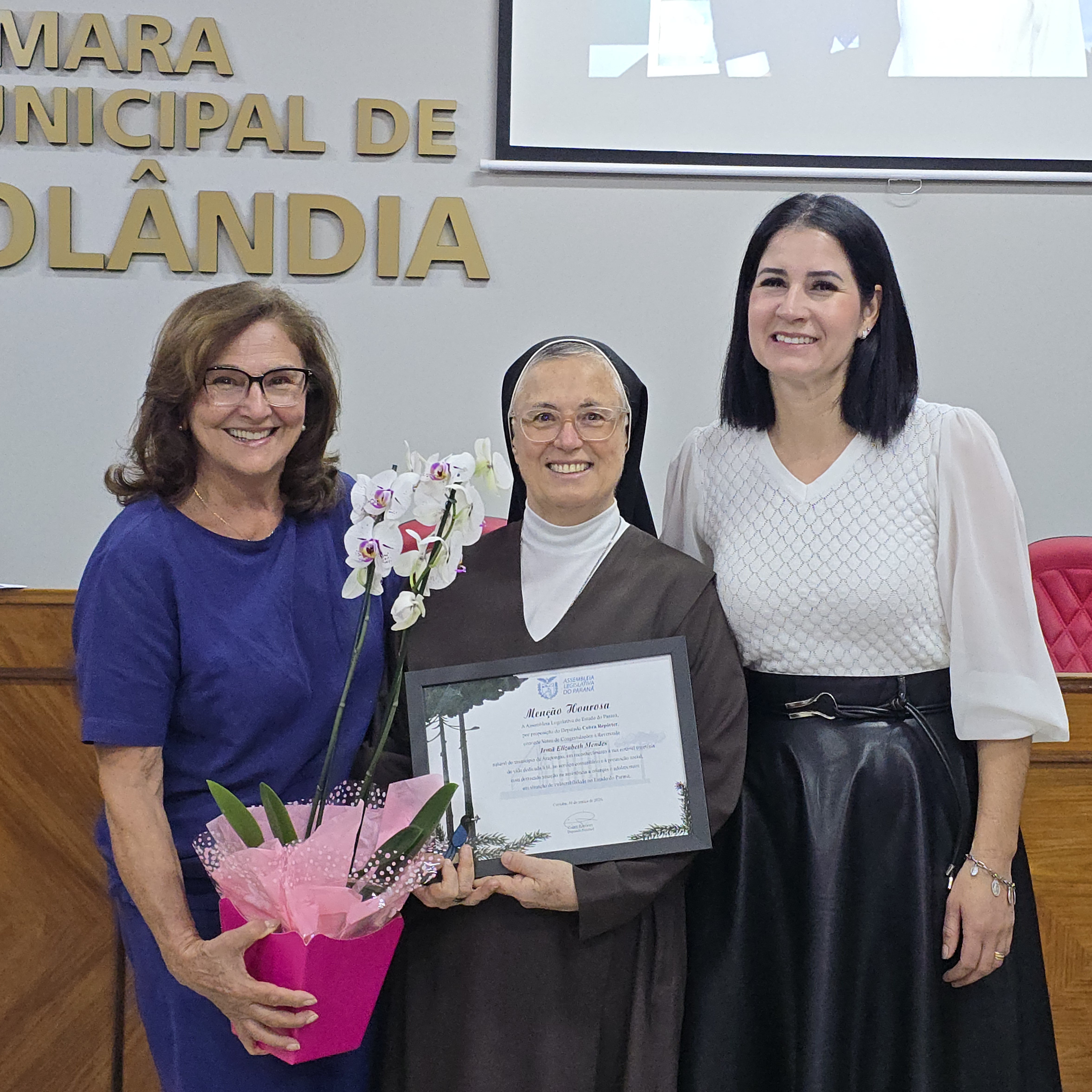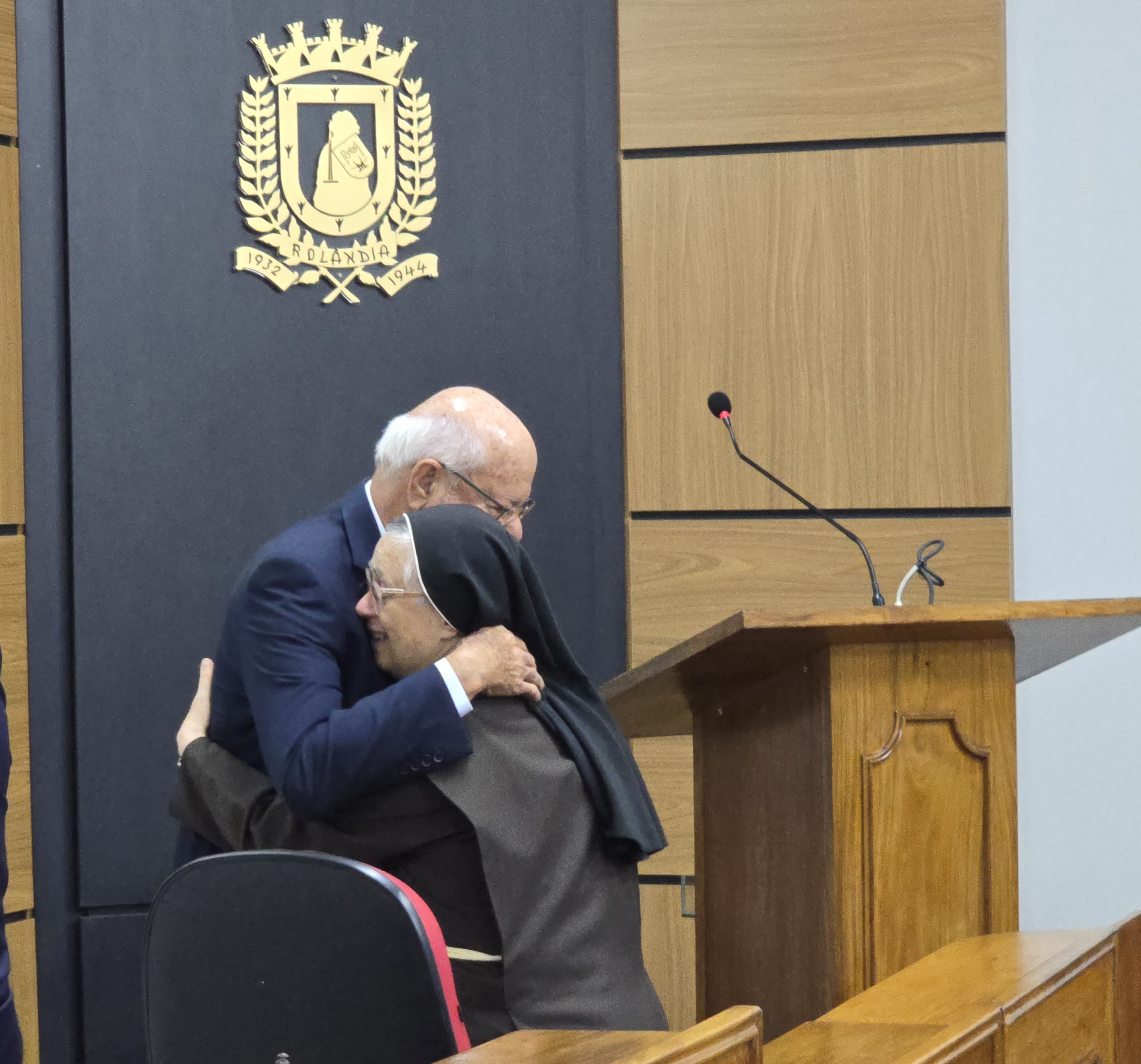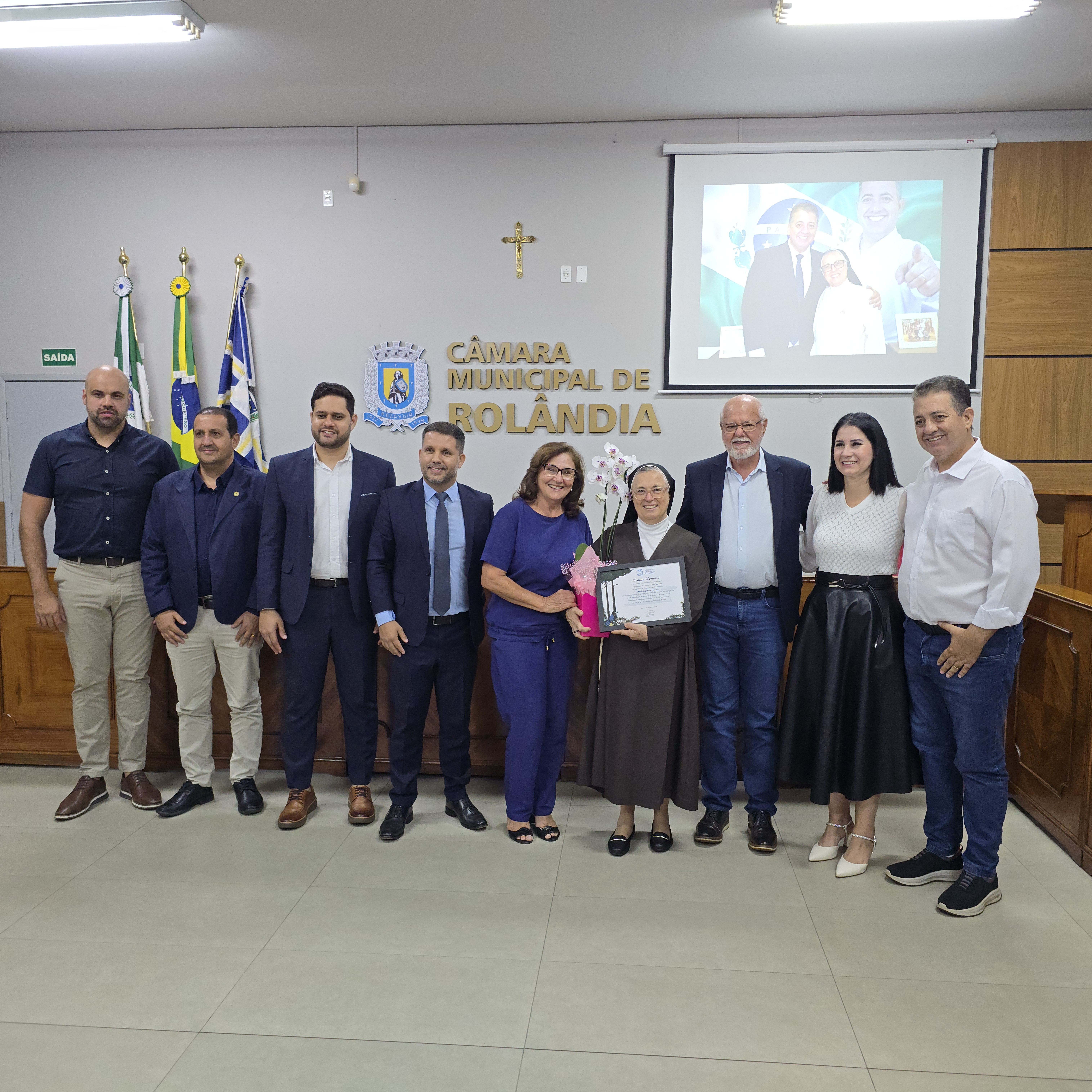 Em solenidade nesta quinta-feira, dia 23 de abril, na Câmara Municipal, a Irmã Elizabeth Mendes, gestora da Unidade Social Nossa Senhora Aparecida (USNSA), da Vila Oliveira, recebeu do deputado estadual Cobra Repórter uma “Menção Honrosa” aprovada pela Assembleia Legislativa do Paraná, em reconhecimento à sua trajetória de vida dedicada à fé, ao serviço comunitário e à promoção social.