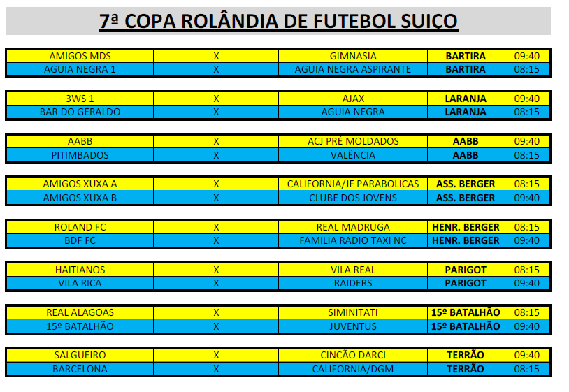 Jogos da 7º Copa Rolândia de Futebol Suiço. Partidas domingo dia 5, válidas pela 2º rodada. ...