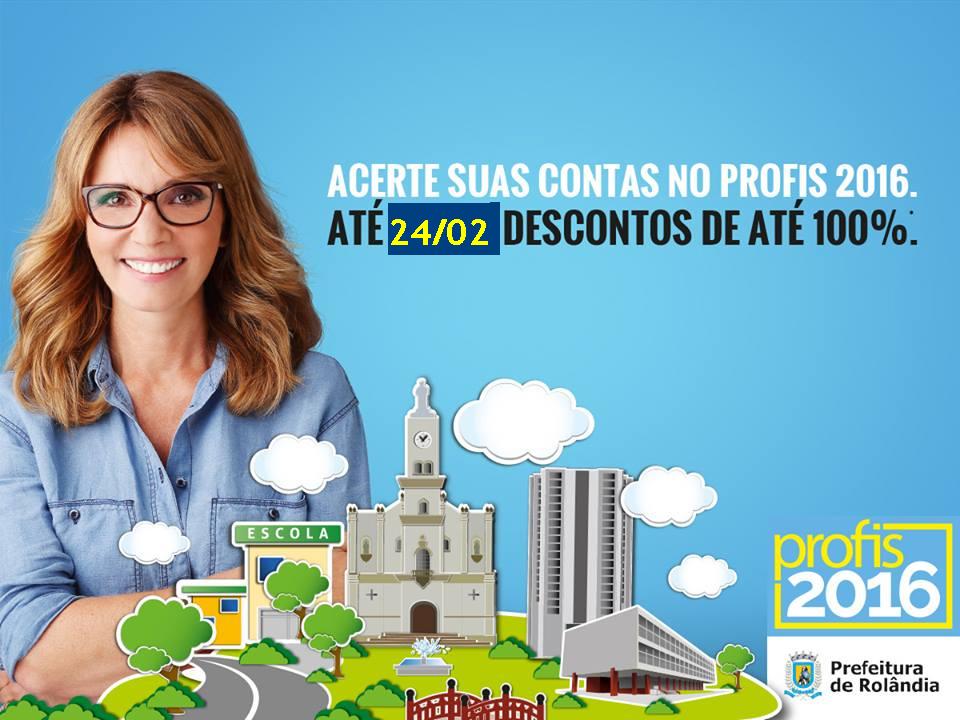 Acerte suas contas no PROFIS 2016! A cidade e o seu bolso agradecem! Então faça a sua parte e quite seus impostos atrasados com a Prefeitura de Rolândia. No PROFIS 2016 você acerta sua dívida em até 6 vezes com até 100% de descontos nos ju...