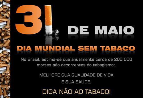 A Secretaria de Saúde promove nesta terça-feira, 31 de maio, ações de conscientização em todas as Unidades Básicas de Saúde alusivas ao Dia Mundial sem tabaco. Em cada Posto de Saúde haverá uma abordagem aos usuários, com panfletagem, pa...