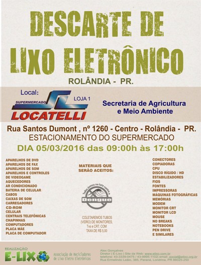 A Secretaria de Agricultura e Meio Ambiente em parceria com a ONG E-Lixo de Londrina, promovem neste sábado, cinco de março, das 9h às 17h, uma coleta de lixo eletrônico. Serão recebidos mouses, CPU´s, teclados, monitores e outros itens eletrô...