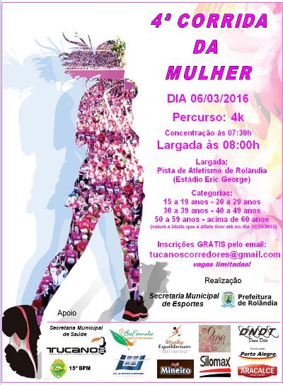 A Prefeitura, por meio da Secretaria de Esporte, promove a 4º Corrida da Mulher, em celebração do Dia Internacional da Mulher. A prova será dia 6 de março, domingo e as inscrições são gratuitas. Para mais informações: ou 3906-1117. ...
