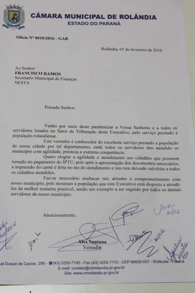Por meio do Ofício nº 0010/2016, de cinco de fevereiro de 2016, o Vereador Alex Santana elogiou o Secretário de Finanças Francisco Ramos e todo o setor de Tributação pelo serviço prestado a população rolandense. Da Assessoria. &nb...