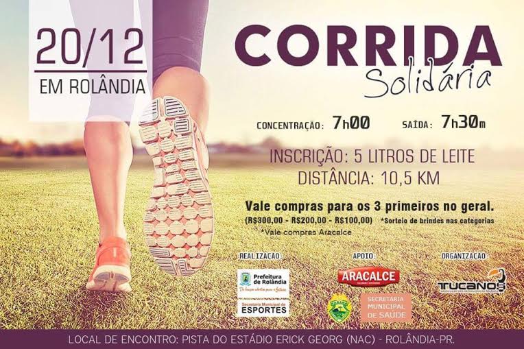 No domingo dia 20, Rolândia terá a Corrida Solidária 2015, com saída às 7h30 do Estádio Erich Georg. A inscrição é de 5 litros de leite por competidor e a distância de 10,5 km. A Prova é de realização da Prefeitura de Rolândia e Secreta...