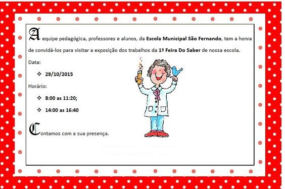 A Escola Municipal São Fernando vai realizar no dia 29 de outubro, quinta-feira, sua “ Primeira Feira do Saber”. Será uma amostra de vários trabalhos realizados por alunos e professores, em que o objetivo principal é a apr...
