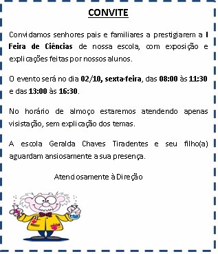 A Escola Municipal Geralda Chaves Tiradentes, situada na Rua Dr. Ferreira Braga, 293 – Jardim Terezópolis, promove nesta sexta-feira, sua Feira de Ciências. A entrada é de graça e na oportunidade, os alunos vão demo...
