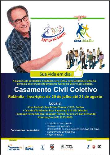 Os interessados devem se inscrever até o dia 21 de Agosto, nas sedes do CRAS de Rolândia. Para a inscrição, é necessária a apresentação da carteira de identidade, CPF, certidão de nascimento atualizada, comprovante de rend...