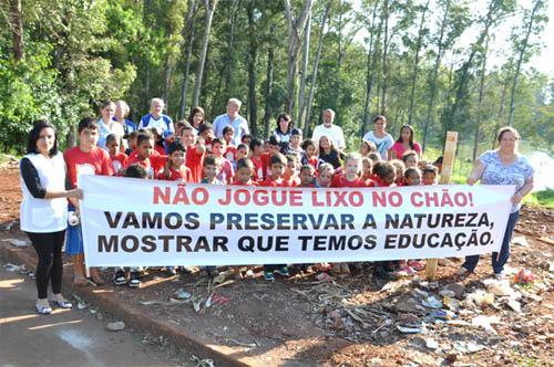 Duas faixas com as frases “Assim como você cuida da sua casa cuide do seu bairro! Não jogue lixo no chão!” e “Não jogue lixo no chão! Vamos preservar a natureza, mostrar que temos educação” foram colocadas em dois pontos principais d...