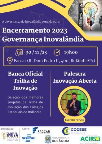 A Governança do Inovalândia realiza no próximo dia 31 de novembro, às 19h, no auditório da Faccar, o encerramento do ano de 2023. No evento terá a Banca Final da Trilha de Inovação e conta...