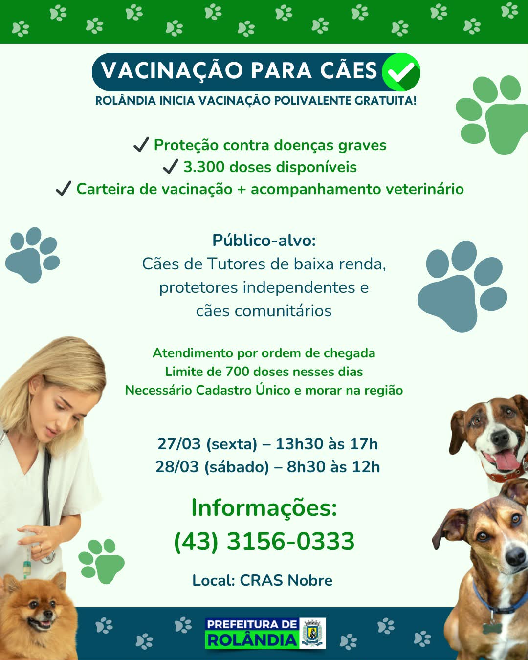 Rolândia inicia vacinação polivalente para cães nesta sexta-feira Em uma ação inovadora, a secretaria de Agricultura e Meio Ambiente adquiriu três mil e trezentas doses da vacina polivalente...
