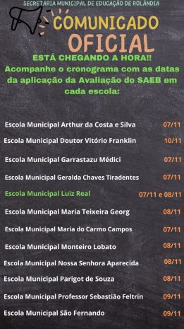Agora é oficial, o Núcleo Regional de Educação de Londrina comunicou a todas as escolas da rede municipal de Rolândia as datas em que irá ocorrer a Avaliação do SAEB. Cada escola terá um ...