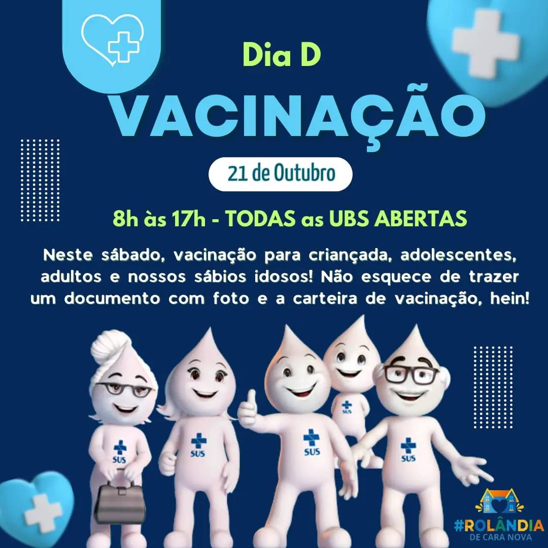 Neste sábado, dia 21/10, das 8h às 17h, todos os Postos de Saúde de Rolândia estarão abertos para VACINAÇÃO!Vacina protege contra doenças. Vacina é saúde!Vacina é qualidade de vida!Para todas as idades: bebês, crianças, jovens, adultos e...
