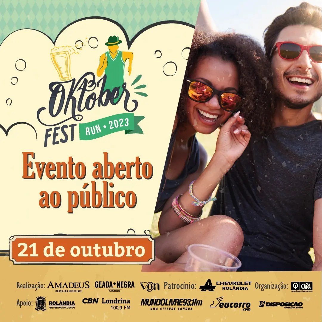 Vem aí a "2° Oktoberfest Run"A secretaria de Esportes informa que no próximo dia 21 de outubro acontece a "2ª Oktoberfest Run", promovida pela Capa Eventos.O evento terá largada e chegada no Estádio Erich George, em Rolândia, a partir das 16h....
