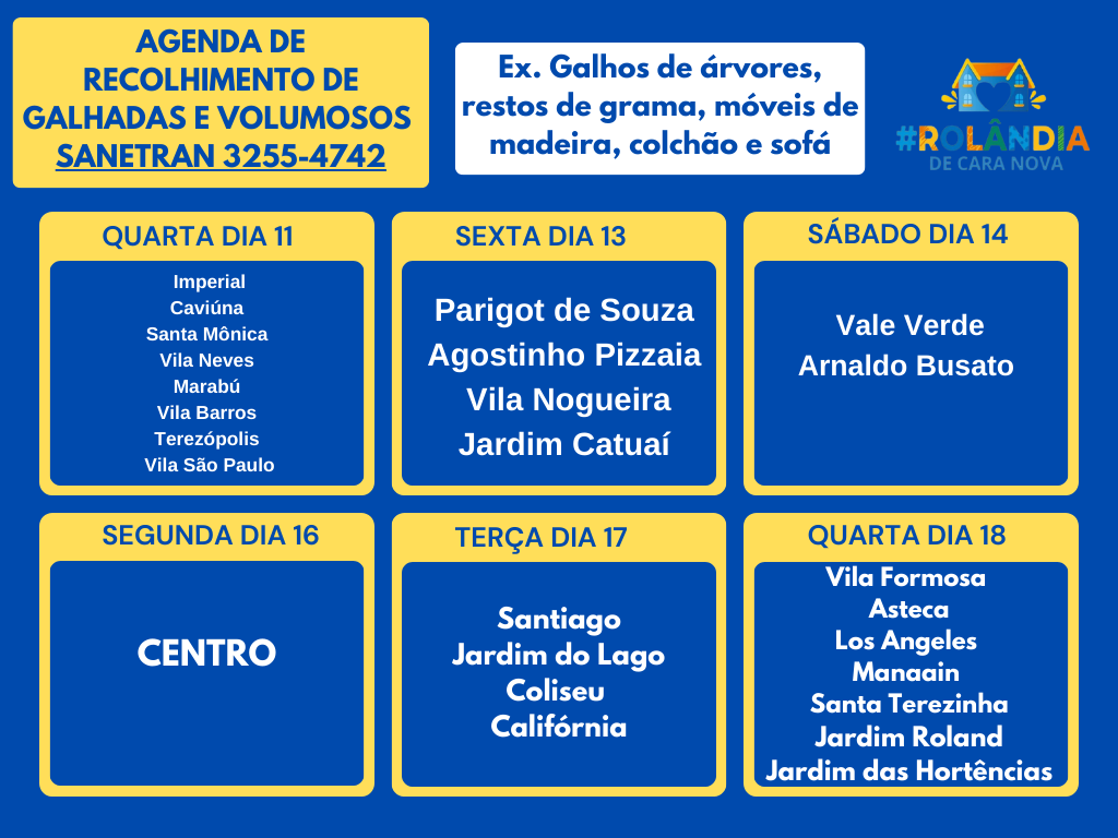 AGENDA DA SANETRAN PARA RECOLHER GALHADAS E VOLUMOSOS As Secretarias de Serviços Públicos e de Agricultura e Meio Ambiente informam que a empresa terceirizada que presta serviço ao município, a SANETRAN, faz a divulgação das regiões em que vai...