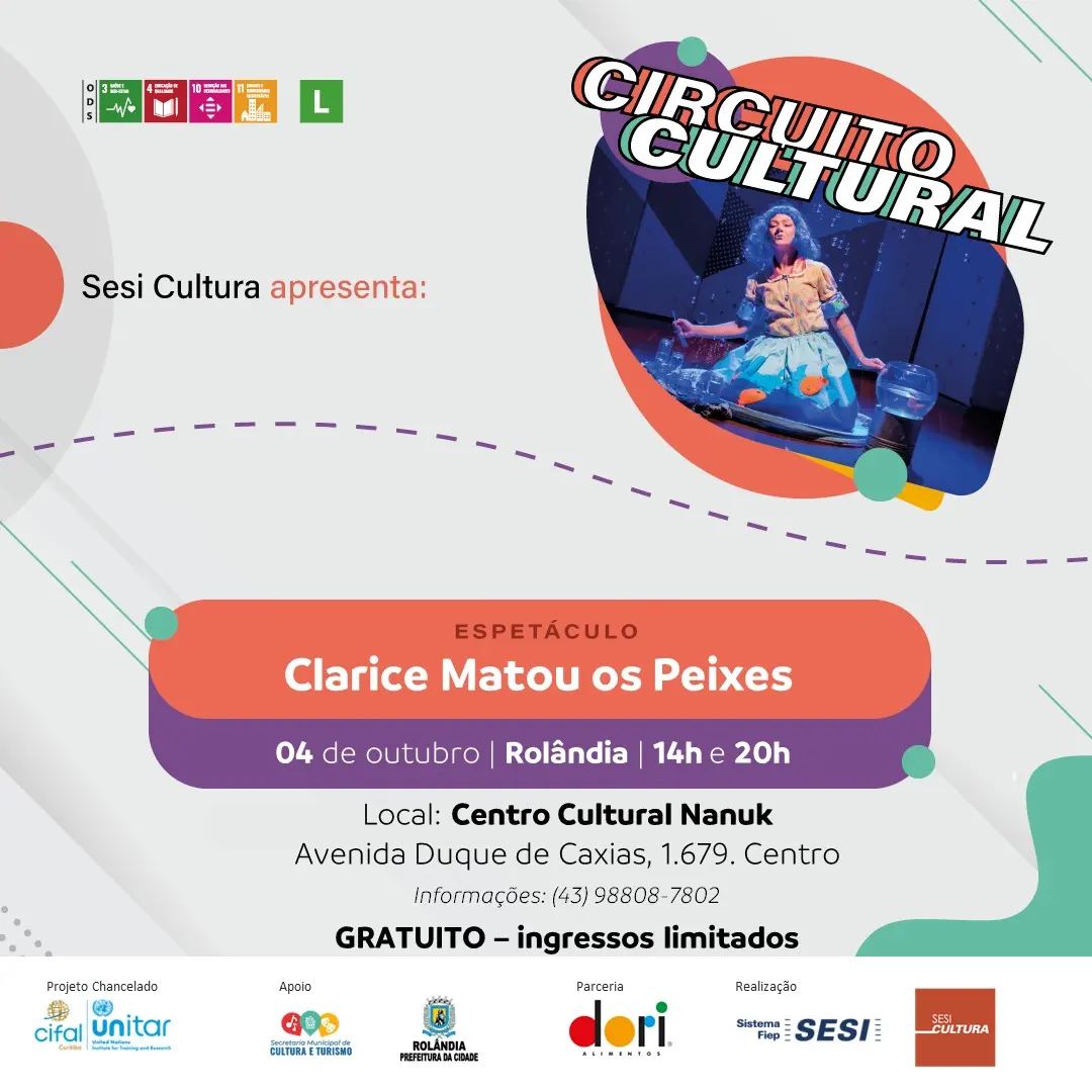 O Circuito Cultural Sesi vem para o Nanuk!A secretaria de Cultura e Turismo informa que esse é o maior projeto de difusão cultural do SESI, com objetivo de promover a difusão da arte, valorizar a diversidade e a pluralidade cultural brasileira.O e...
