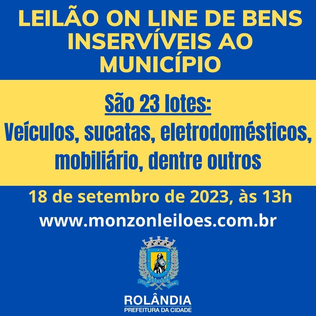AVISO DE LEILÃO A Secretaria de Compras, Licitações e Patrimônio informa leilão de bens inservíveis ao município.Objeto: O Município de Rolândia torna público que na data estipulada neste termo e em seu edital, ocorrerá o leilão de bens i...