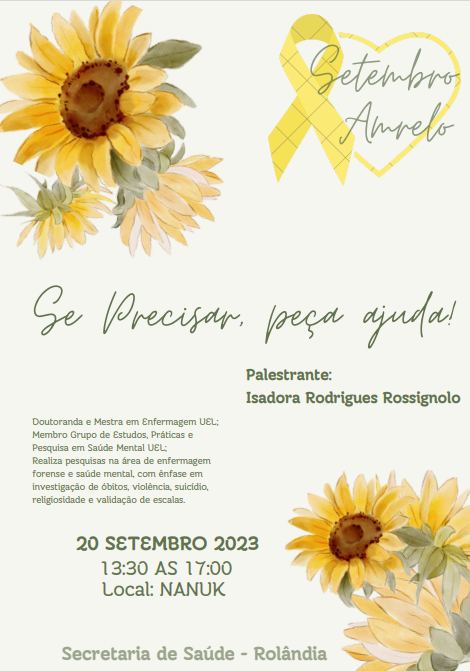 PALESTRA SOBRE A VALORIZAÇÃO DA VIDA, DIA 20 DE SETEMBRO, NO CENTRO CULTURAL NANUKA secretaria de Saúde informa que setembro é o mês adotado como de campanha de conscientização sobre a prevenção do suicídio. Segundo dados da OMS (Organizaç...