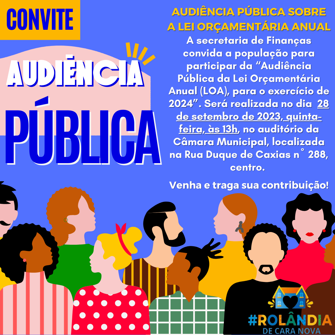 AUDIÊNCIA PÚBLICA SOBRE A LEI ORÇAMENTÁRIA ANUALA secretaria de Finanças convida a população para participar da "Audiência Pública da Lei Orçamentária Anual (LOA), para o exercício de 2024", que será realizada no dia 28 de setembro de ...