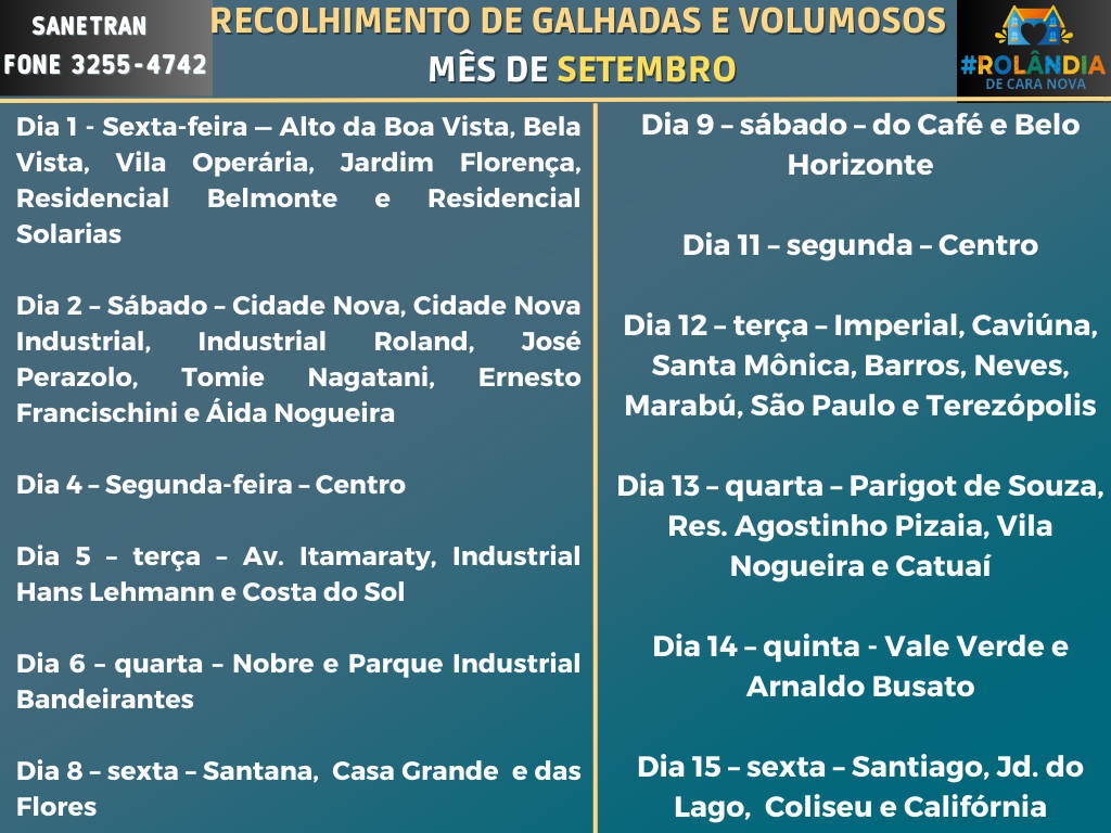 AGENDA DA SANETRAN PARA RECOLHER GALHADAS E VOLUMOSOS -SETEMBROAs Secretarias de Serviços Públicos e de Agricultura e Meio Ambiente informam que a empresa terceirizada que presta serviço ao município, a SANETRAN, faz a divulgação das regiões e...
